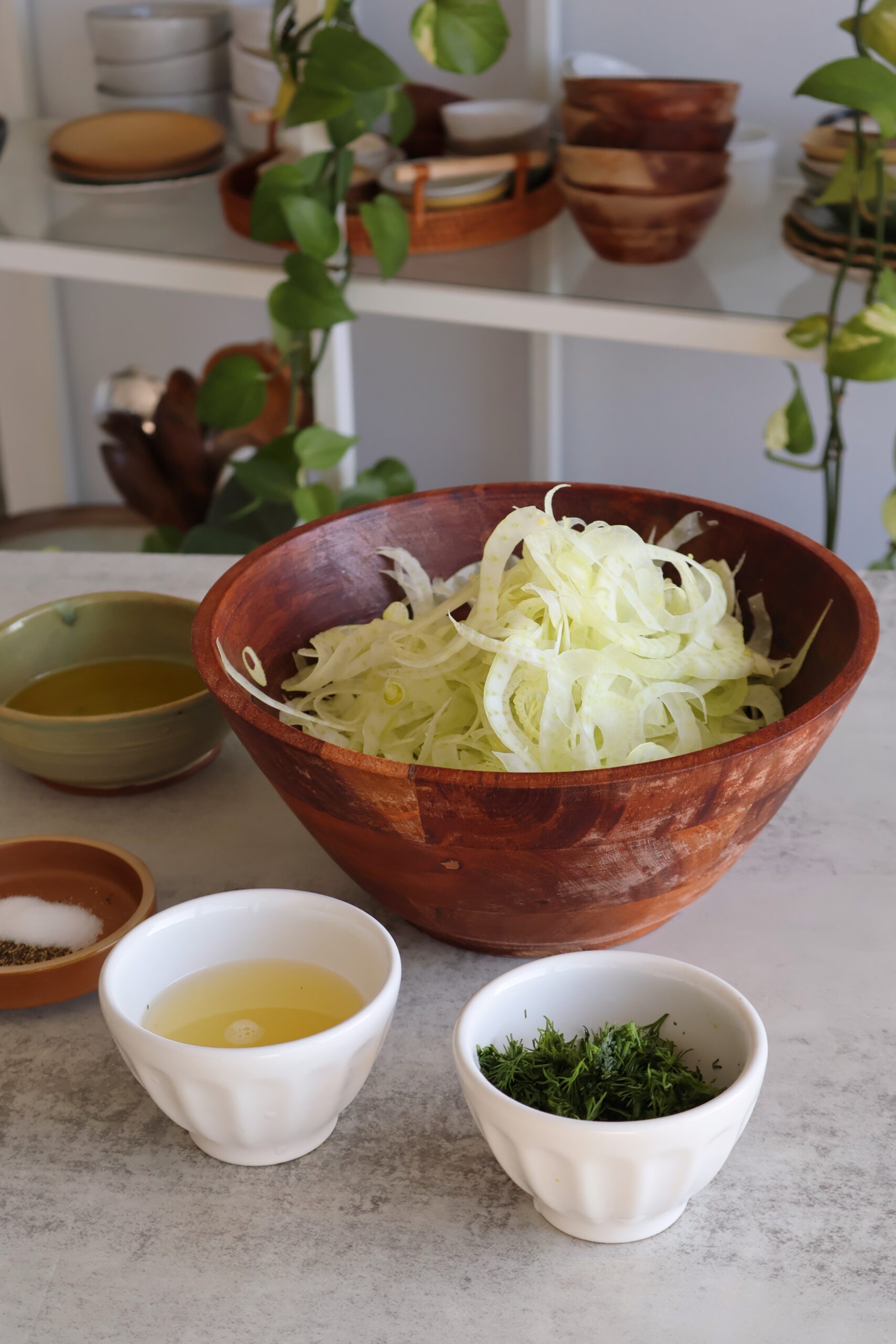 - Add the shaved fennel to a bowl with the chopped dill, and toss together with the olive oil, lemon juice, salt & pepper.