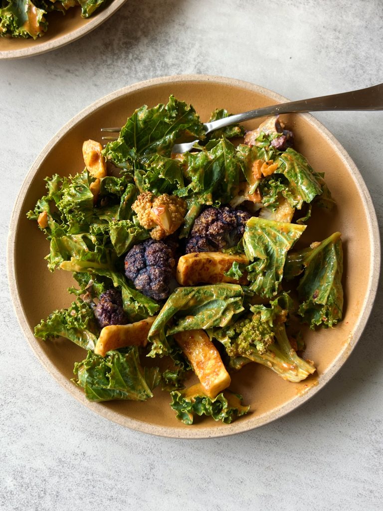 Kale salad massaged with a creamy harissa almond butter dressing, then tossed with grilled halloumi, roasted cauliflower, and chopped almonds.
