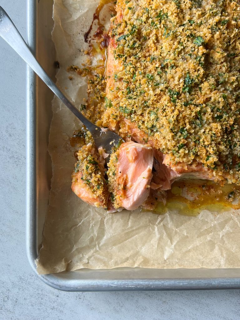 A delicious 20-minute meal made with a salmon fillet thats brushed with a 2-ingredient honey mustard sauce, then seasoned and topped with bread crumbs and baked until flakey.