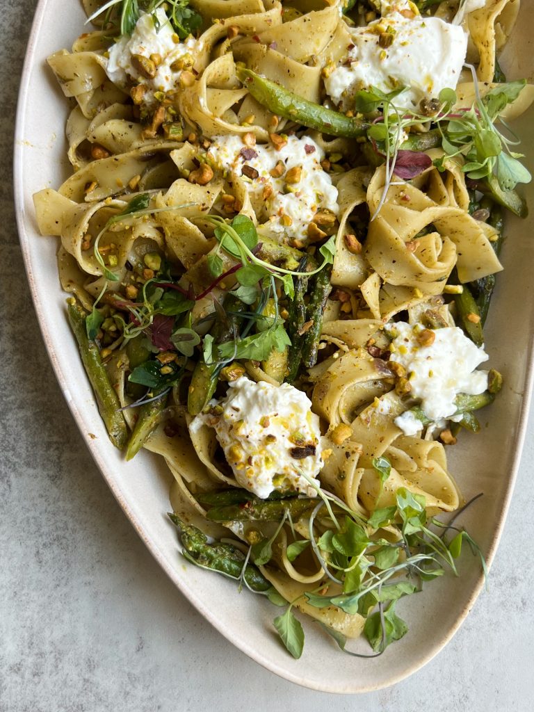 Cooked pasta served with a lemony pesto sauce and topped with burrata, microgreens and crushed pistachios. Simple, flavorful and delicious.