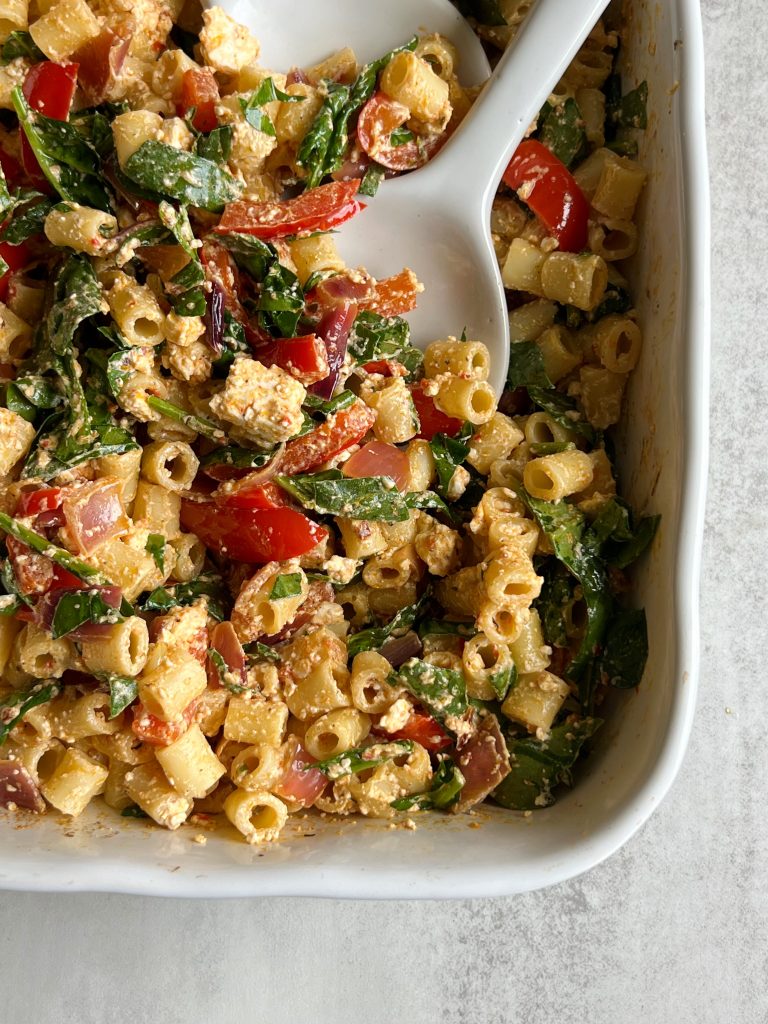 Chopped peppers, onion and garlic are roasted with a block of feta, harissa and spices until soft, then mixed together with spinach and cooked pasta. A low effort dinner that can be flavored in so many ways!