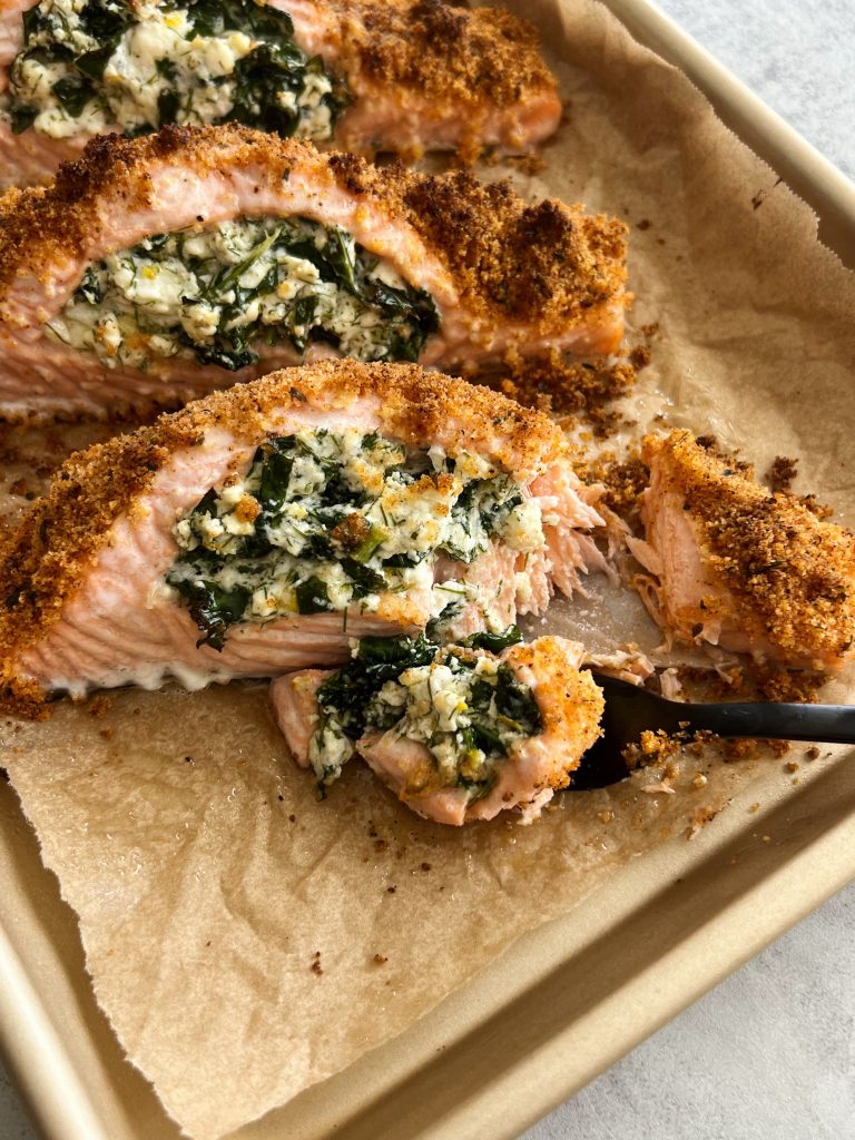 Feta stuffed salmon is a delicious way to elevate your weeknight meals. Salmon fillets are stuffed with a kale and feta mix, then breaded and baked until crisp and tender.