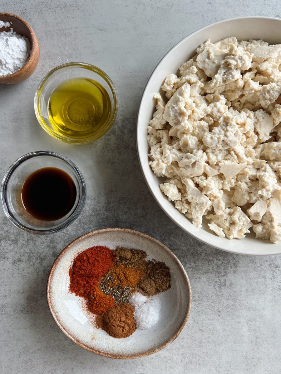 - Prepare the tofu: crumble the tofu into a bowl and toss it with olive oil, spices and tapioca flour. Bake for about 45 minutes until browned and crispy