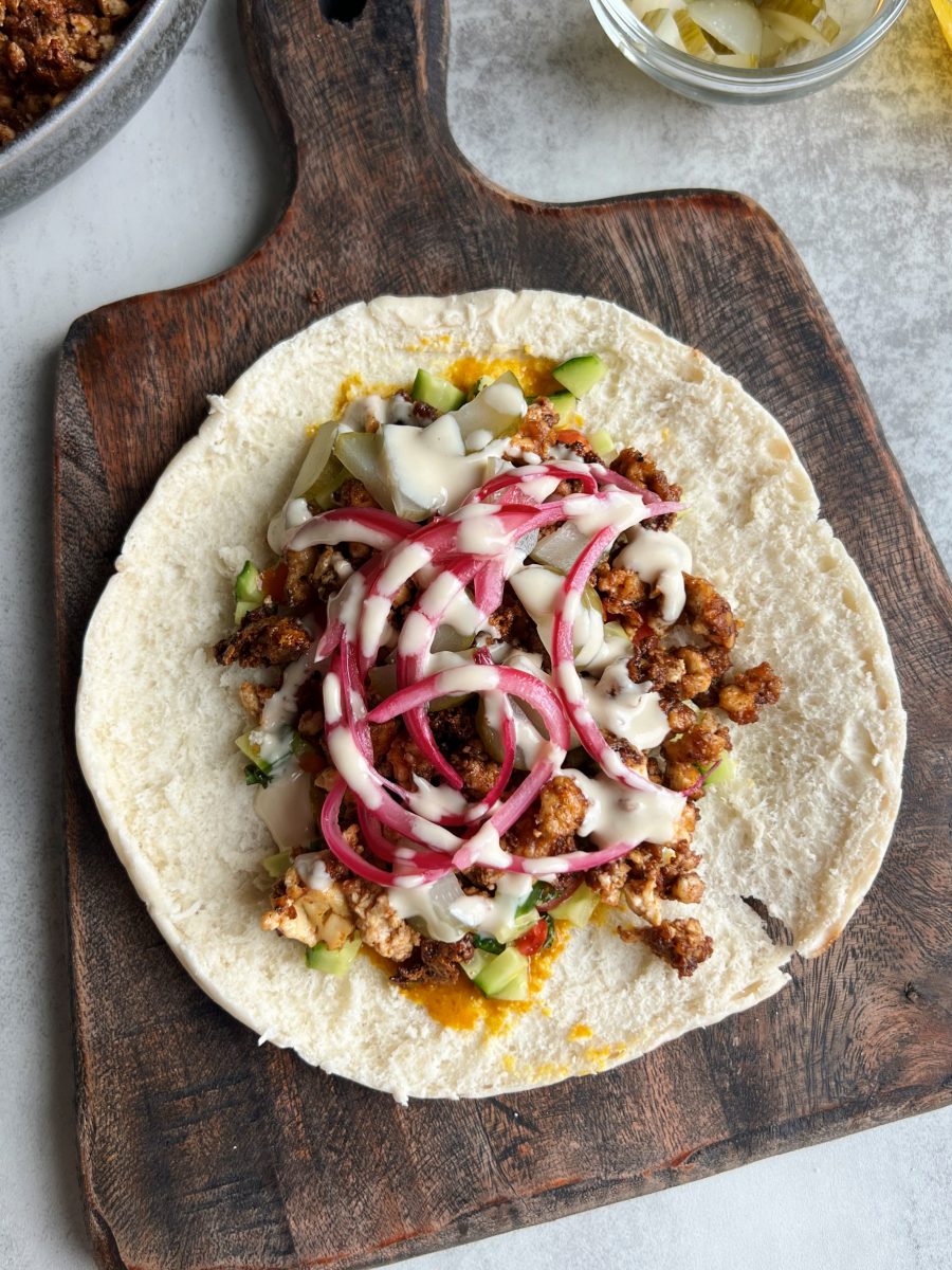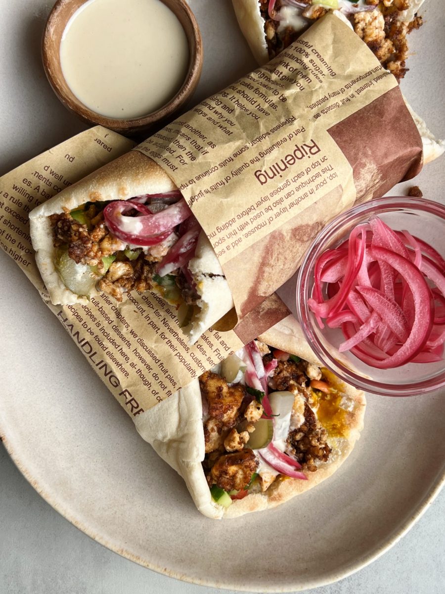 - Once the tofu is ready, assemble your wraps. Slice open your pita in half and spread amba across the middle. Layer with the tofu crumbles, chopped salad, pickled onions, pickles, and a drizzle of tahini. Fold the pita over the center and hold together using parchment or foil. Alternatively, you can cut open the top of the pita and fill the pita with all of the fillings. Drizzle with extra tahini sauce when serving.