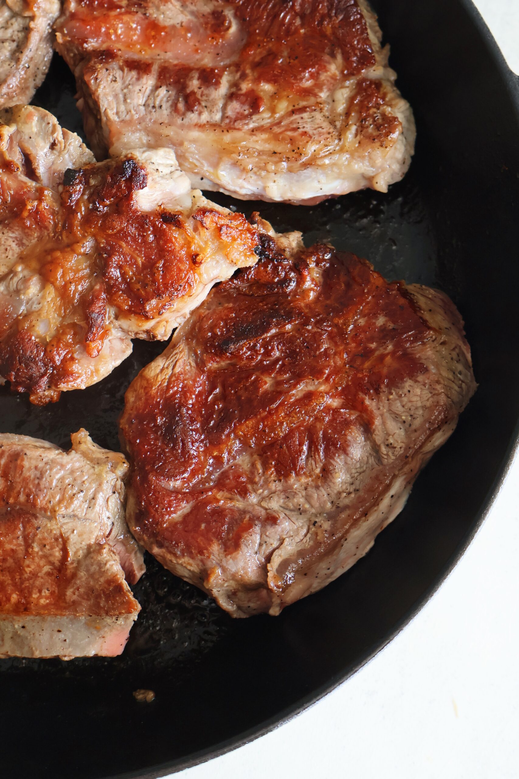 - Season the steaks with a little salt & pepper on each side. Sear the steaks on both sides for about 2-3 minutes, until browned.