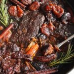 - Place the meat back in with the water, then top with the dried fruit, cinnamon sticks and date syrup