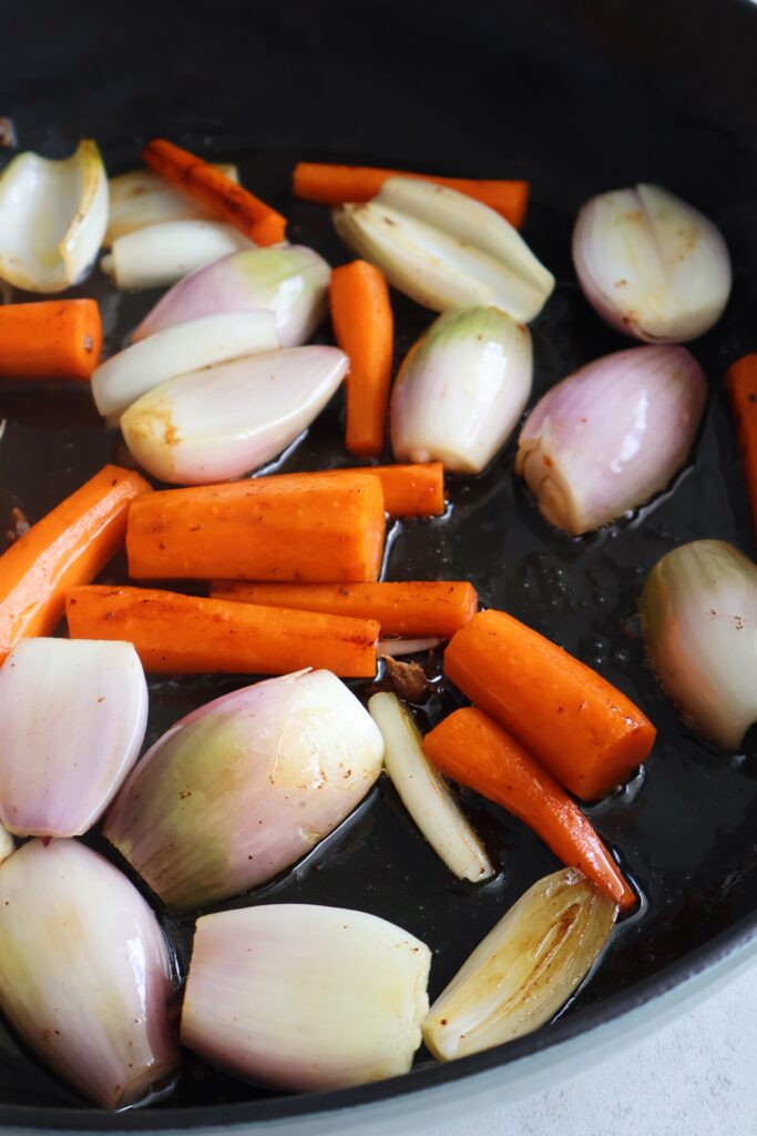 - Remove the meat from the pan and lower the heat to medium. Add in remaining two tablespoons of olive oil with the chopped carrots and shallots. Saute for about 5-7 minutes, tossing every two minutes.