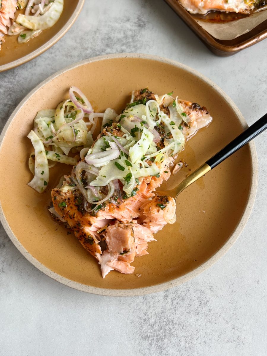 Slow roasted salmon with fennel slaw is a delicious way to eat more fish. I’m obsessed with this recipe and can’t wait for you guys to try it!
