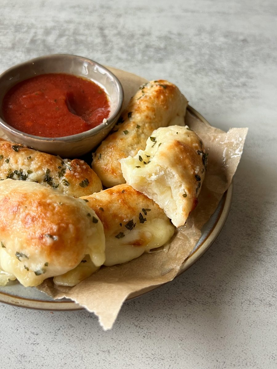 I love whipping up an easy side dish for dinners and these small-batch breadsticks are the perfect little treat. They’re topped with a garlic butter sauce and served with some marinara sauce for dipping.