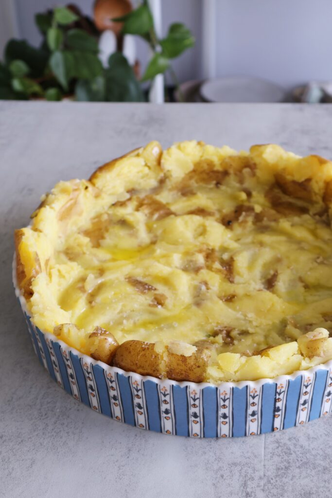 - Bake for another 35 minutes, until the filling is firm to touch. Place under the broiler for 2 minutes at the end to crisp the potatoes.