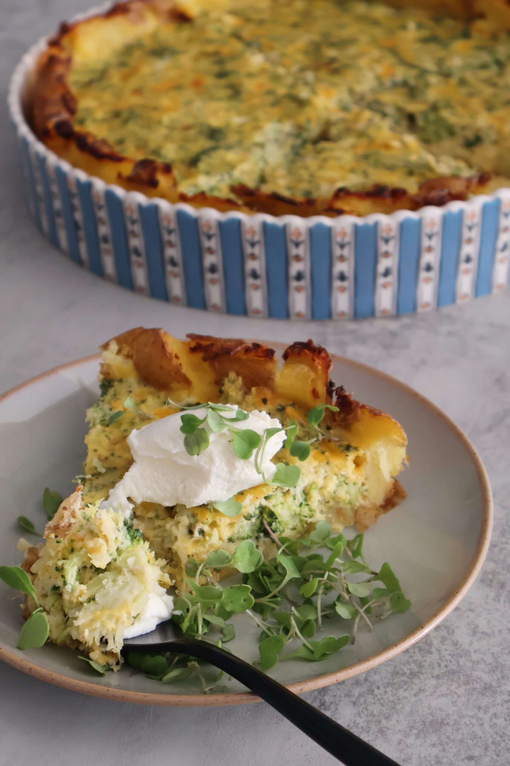 This gluten-free quiche recipe has a smashed potato crust, and a cheese and broccoli egg filling made with just a few simple ingredients. It’s the perfect hearty recipe for breakfast, lunch or dinner.