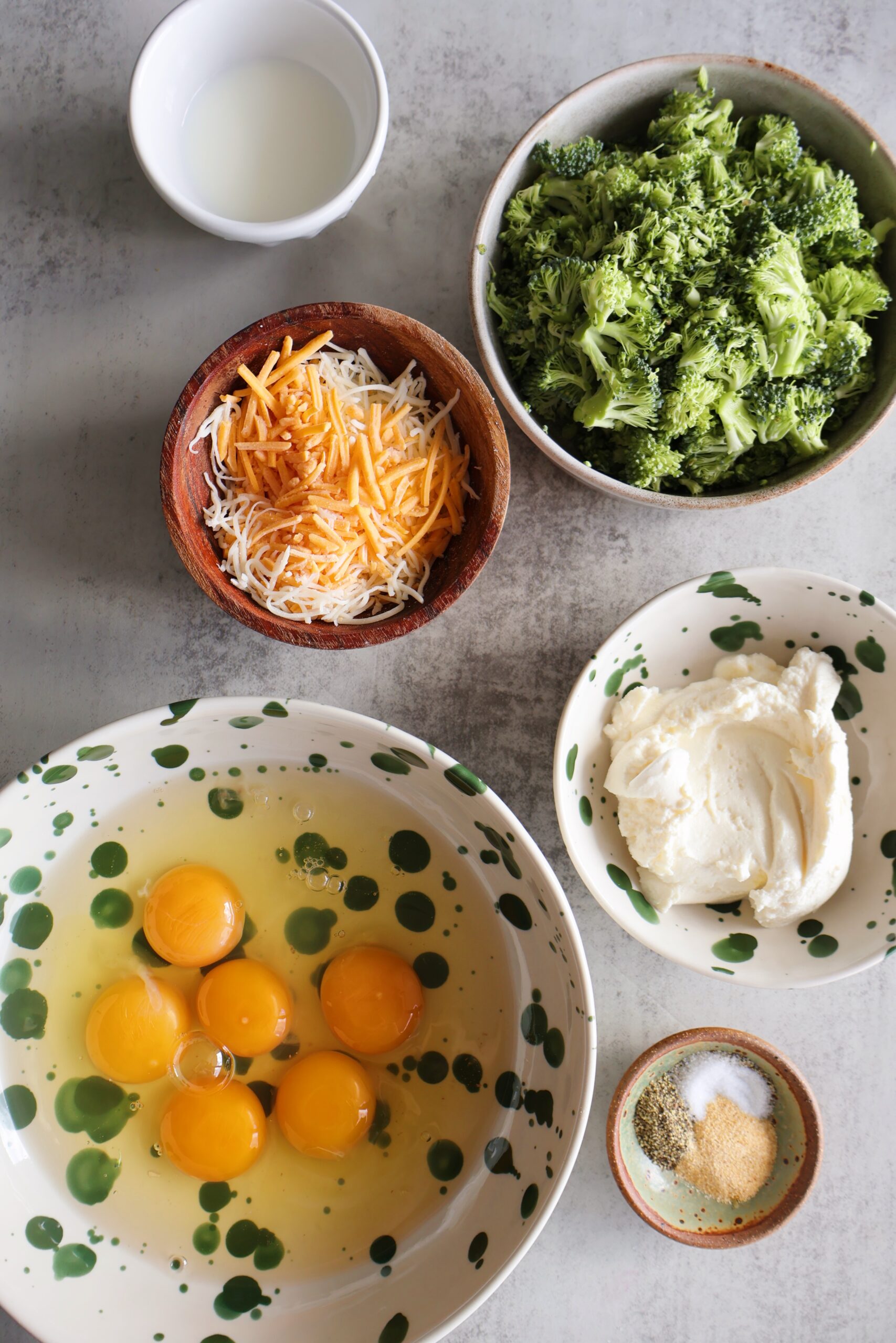 - In a large bowl, whisk together the eggs, ricotta, shredded cheese, chopped broccoli, milk and spices. Mix until smooth.
