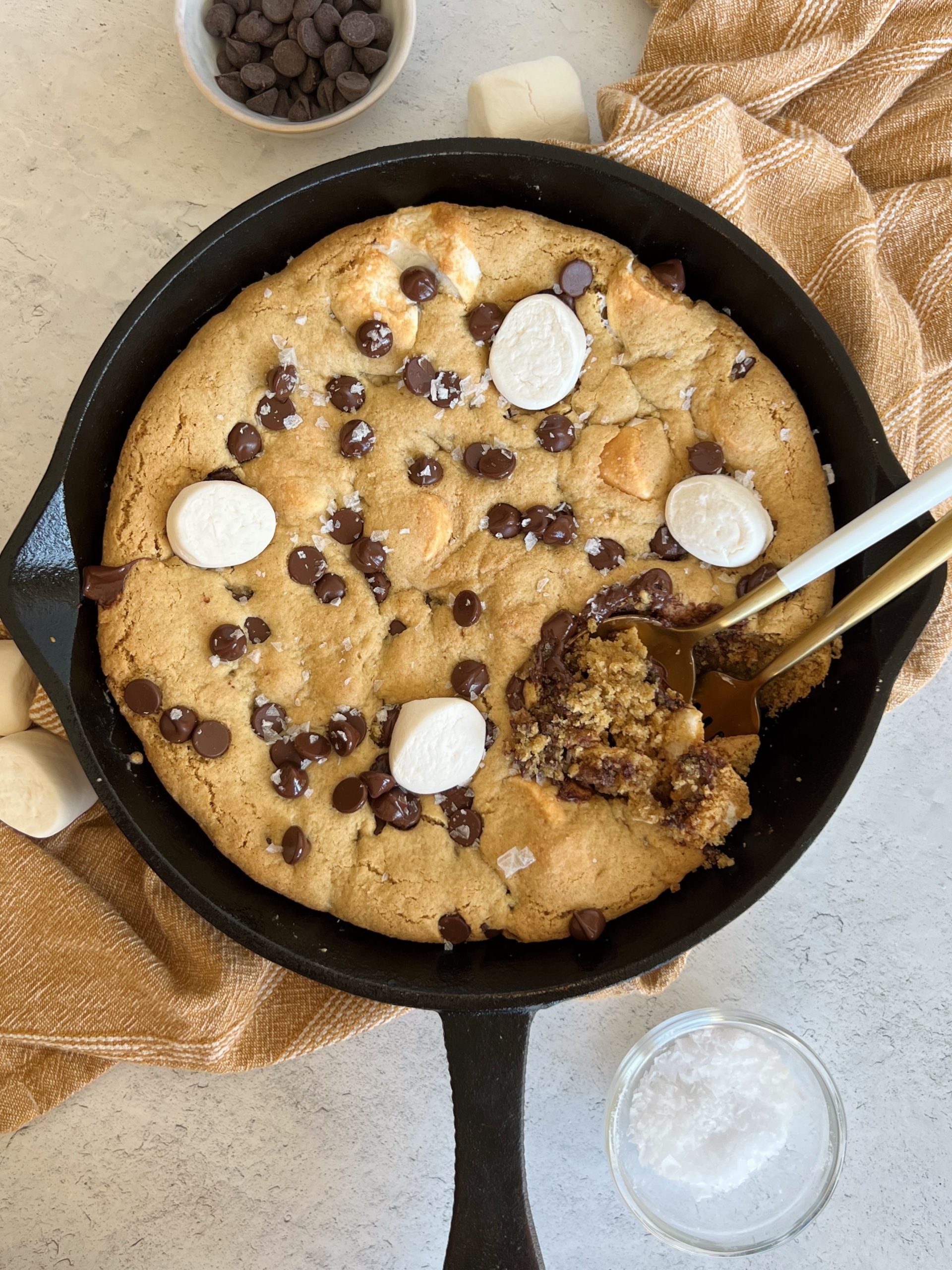 S’mores cookie skillet! A soft baked chocolate chip cookie skillet with gooey marshmallows- combining the best of both worlds into one delicious bite! Serve it warm with your favorite vanilla ice cream for the most delicious dessert.