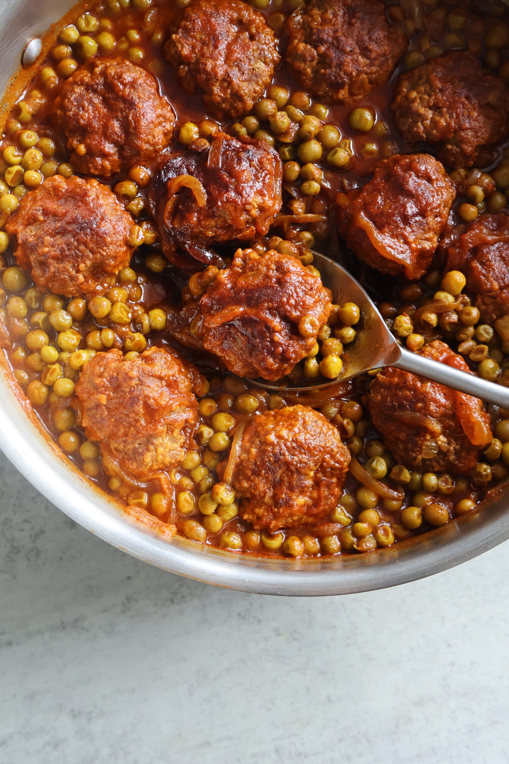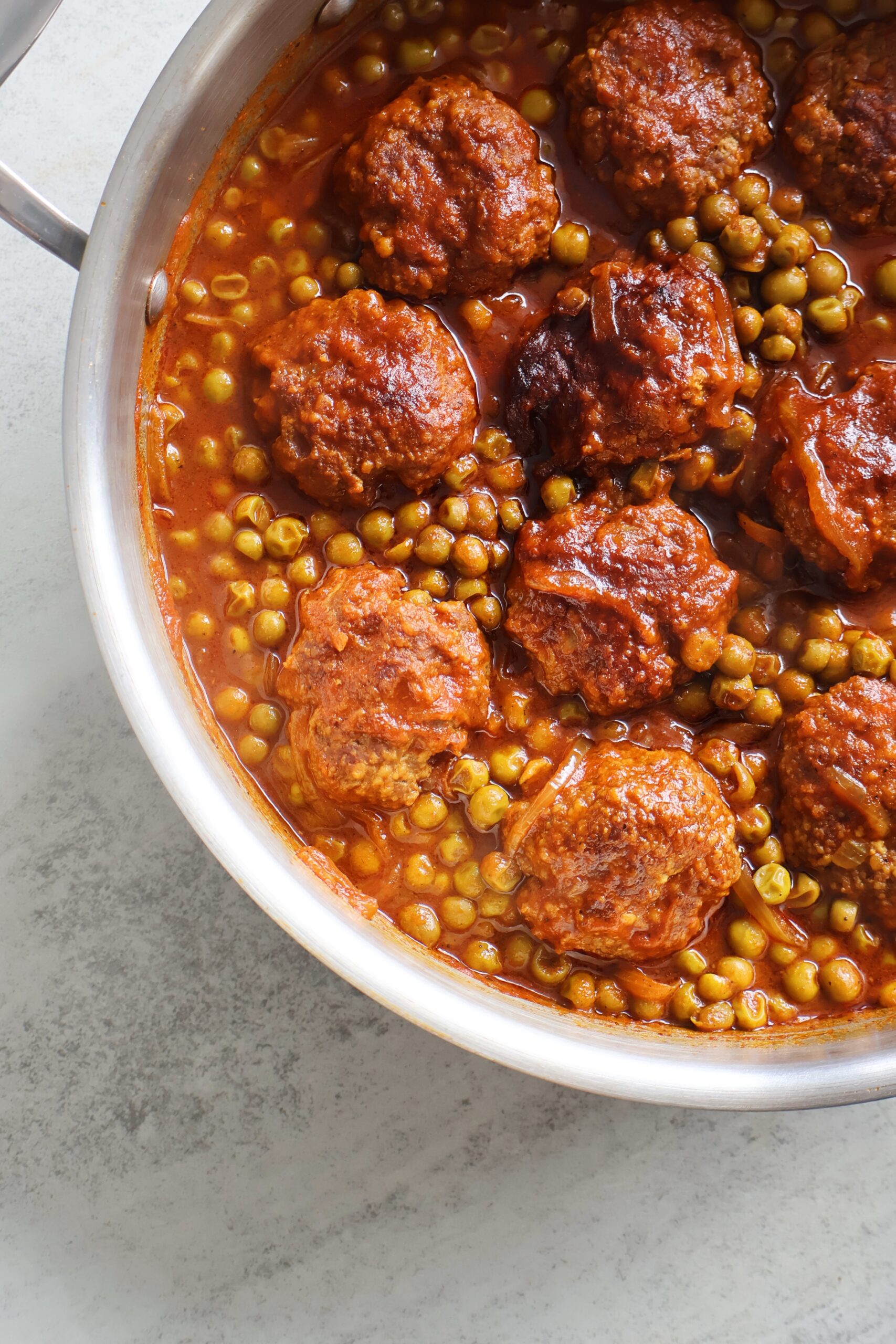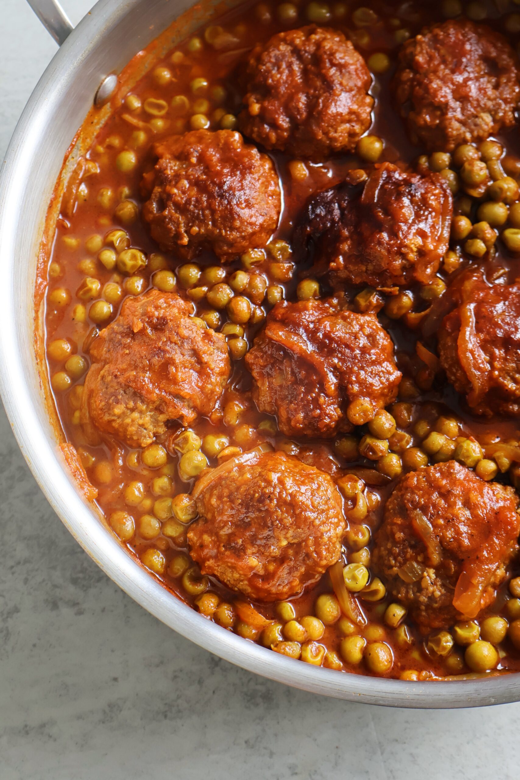 This dish is a childhood favorite of mine and one I always go back to when I’m craving a home cooked meal. It’s a flavor-packed recipe made of spiced meatballs that are seared then cooked in a tomato- based sauce with peas and tons of warm spices.