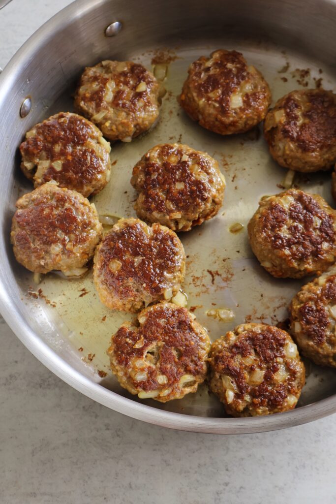 - Heat a large skillet or wide pot on medium heat with about 2 tbsp of olive oil. Sear each side of the meatball for about 3 minutes per side until browned, then remove from the pan and set aside.