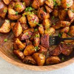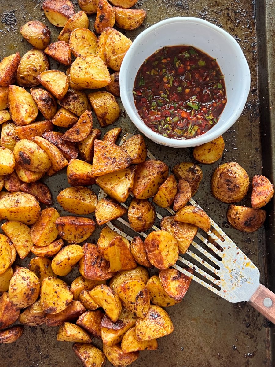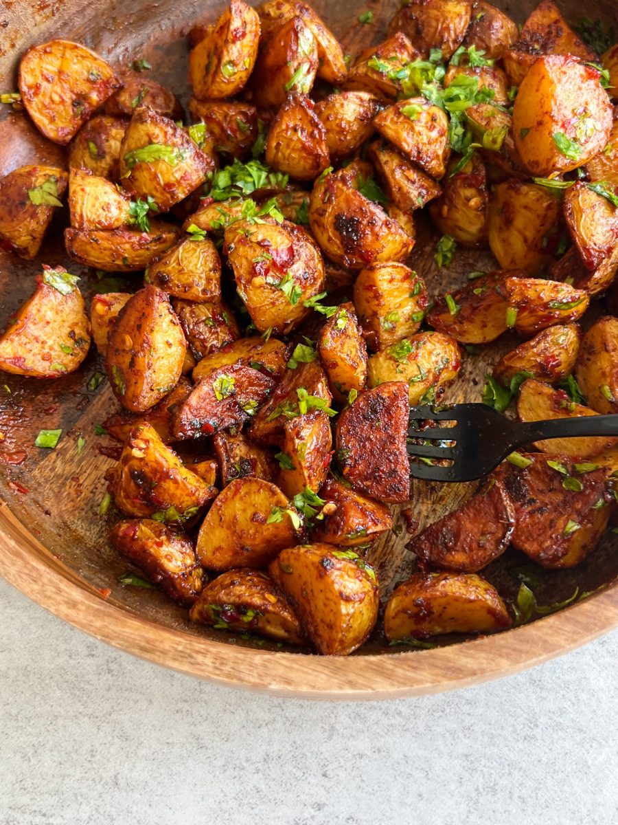 The baby potatoes are sliced and tossed in a few simple seasonings, baked until crispy, then tossed together in a harissa date syrup glaze. They’re tender, spicy, and so flavorful!