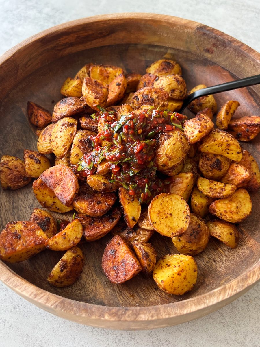 These spiced roasted potatoes tossed in a 3-ingredient harissa date glaze are truly the perfect side dish if you love all things spicy. They come together so easily and can be served with just about any main course.