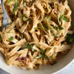 I love using a wide noodle variety for this recipe, like fettuccine, wide lo-mein noodles, or rice noodles. Simply cook the pasta, saute the veggie mix until tender, then toss everything together with your blended sauce.