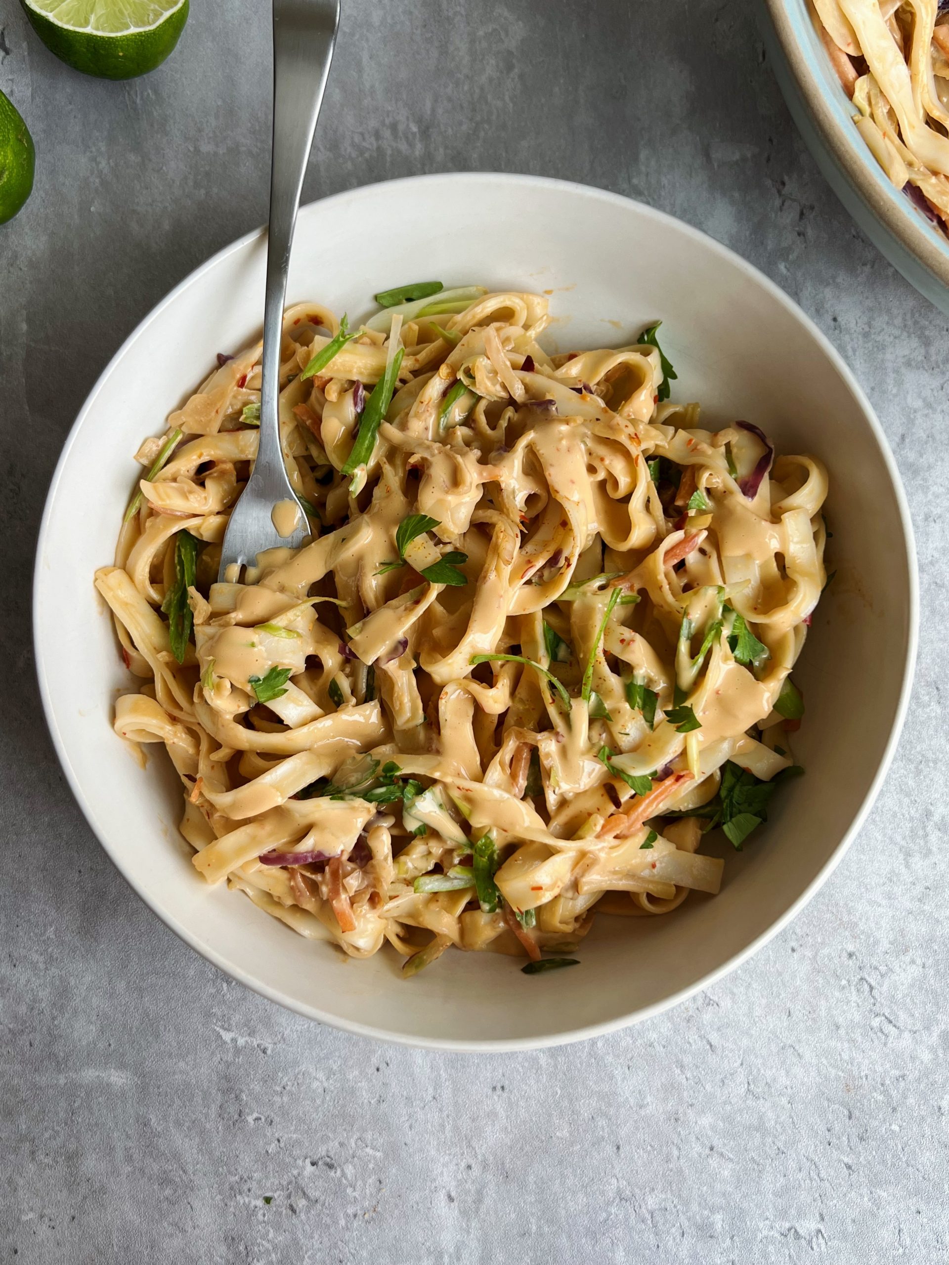 - Add the noodles to a large bowl with the cooked veggies and toss together with the sauce.