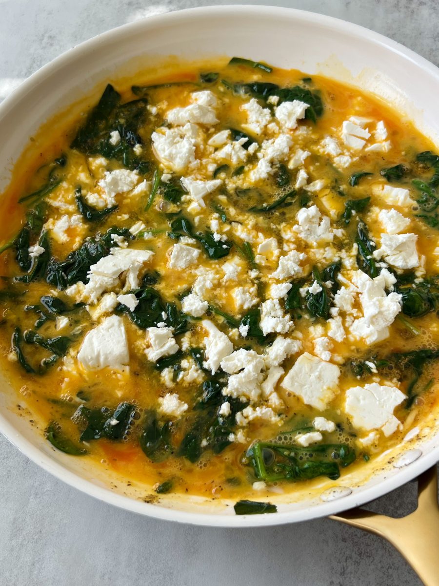 - Cook the omelette. Whisk together the eggs and add them to the spinach with the feta cheese and your spices. Scramble the eggs and cook them for about 8-10 minutes