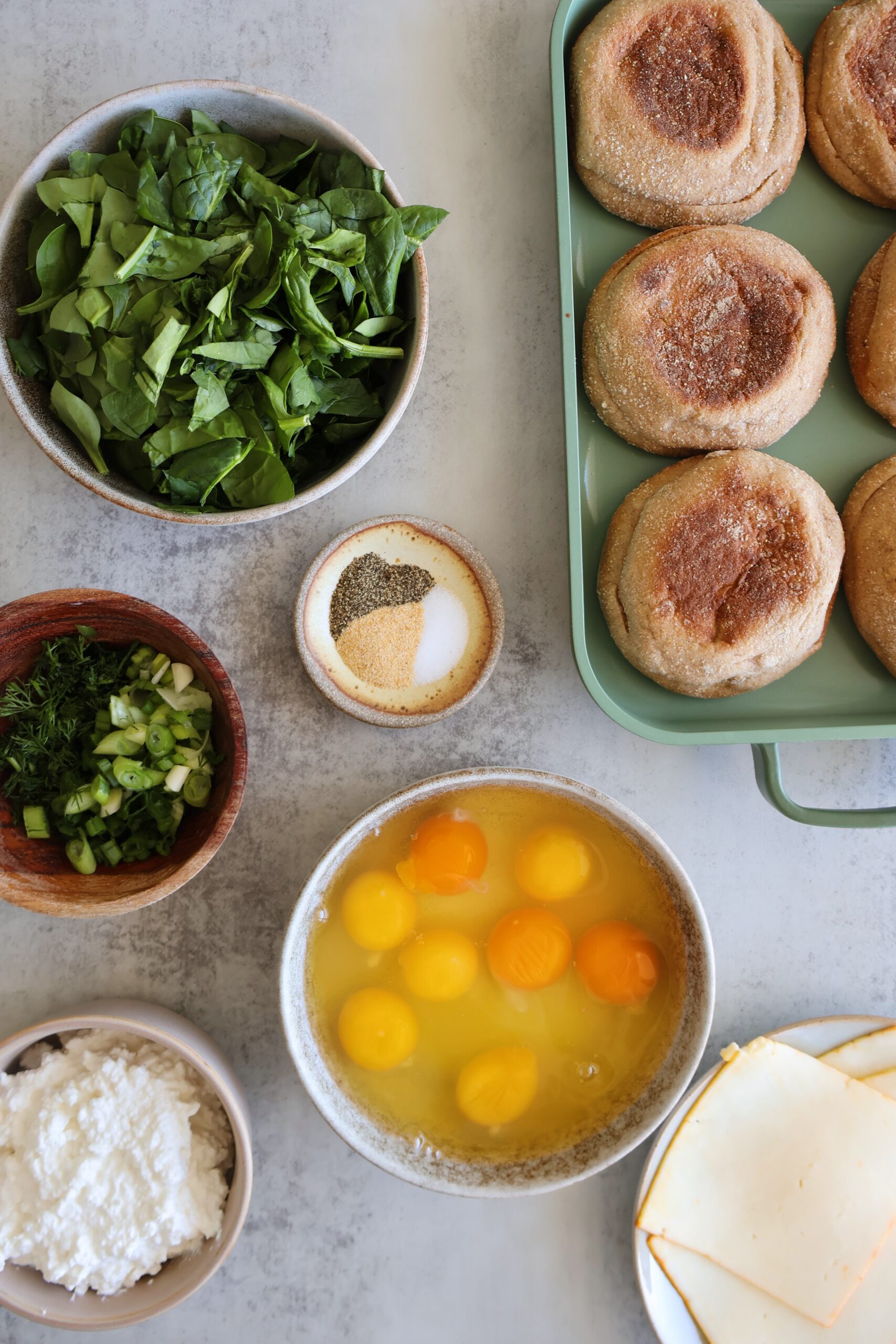 Having my fridge and freezer stocked with ready-to-grab breakfast items are a must to start my mornings off right. I typically like to have a sweet and savory option prepared, and these spinach and herb breakfast sandwiches are always my top choice.