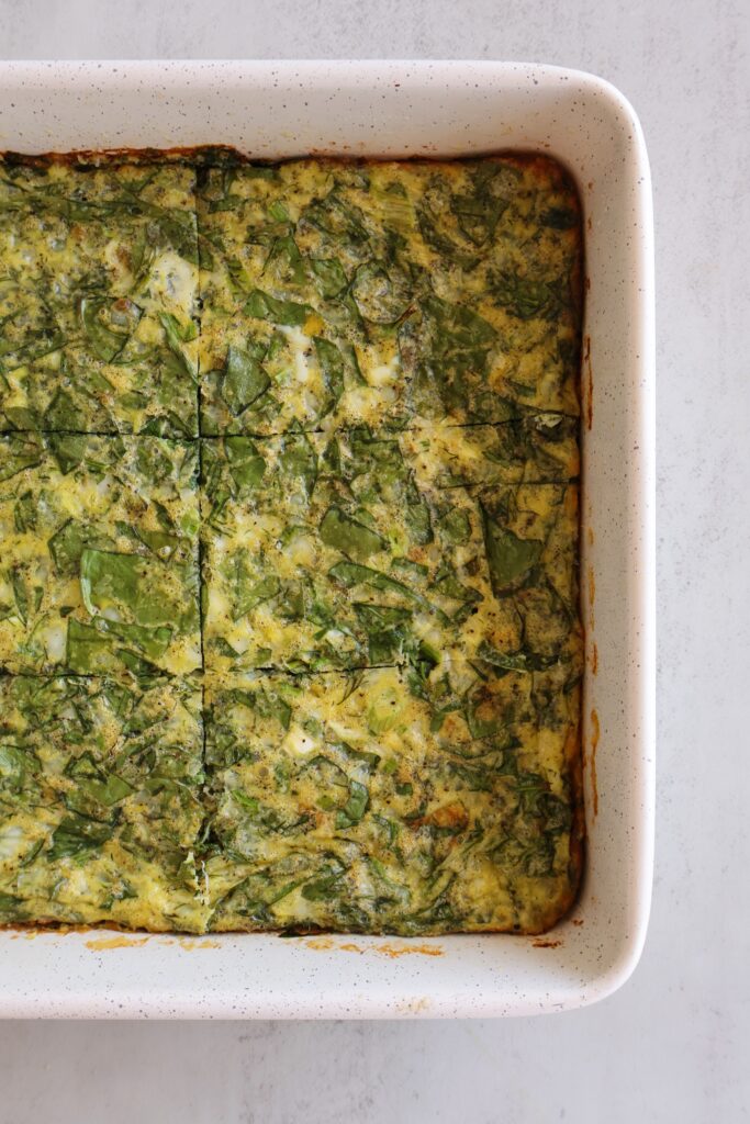 - In a large bowl, whisk together the eggs and cottage cheese. Add the chopped spinach, scallions, dill, parsley and spices and whisk well