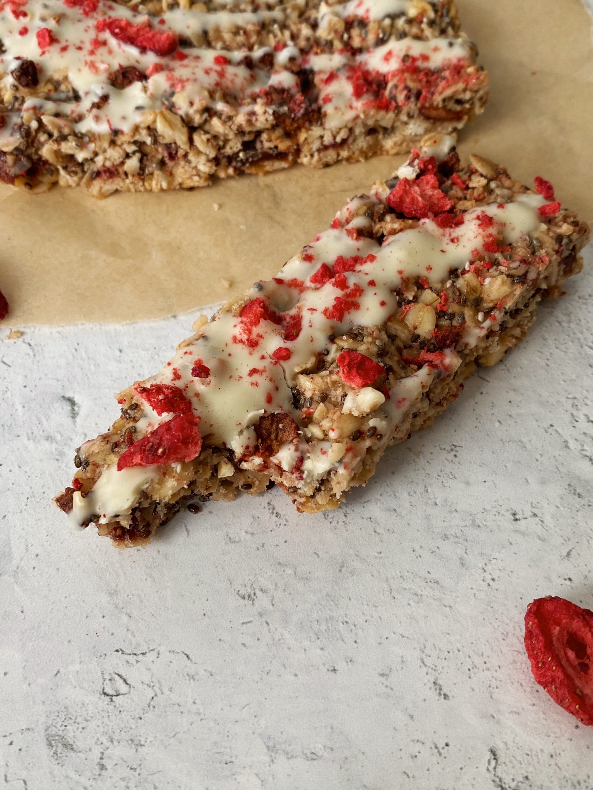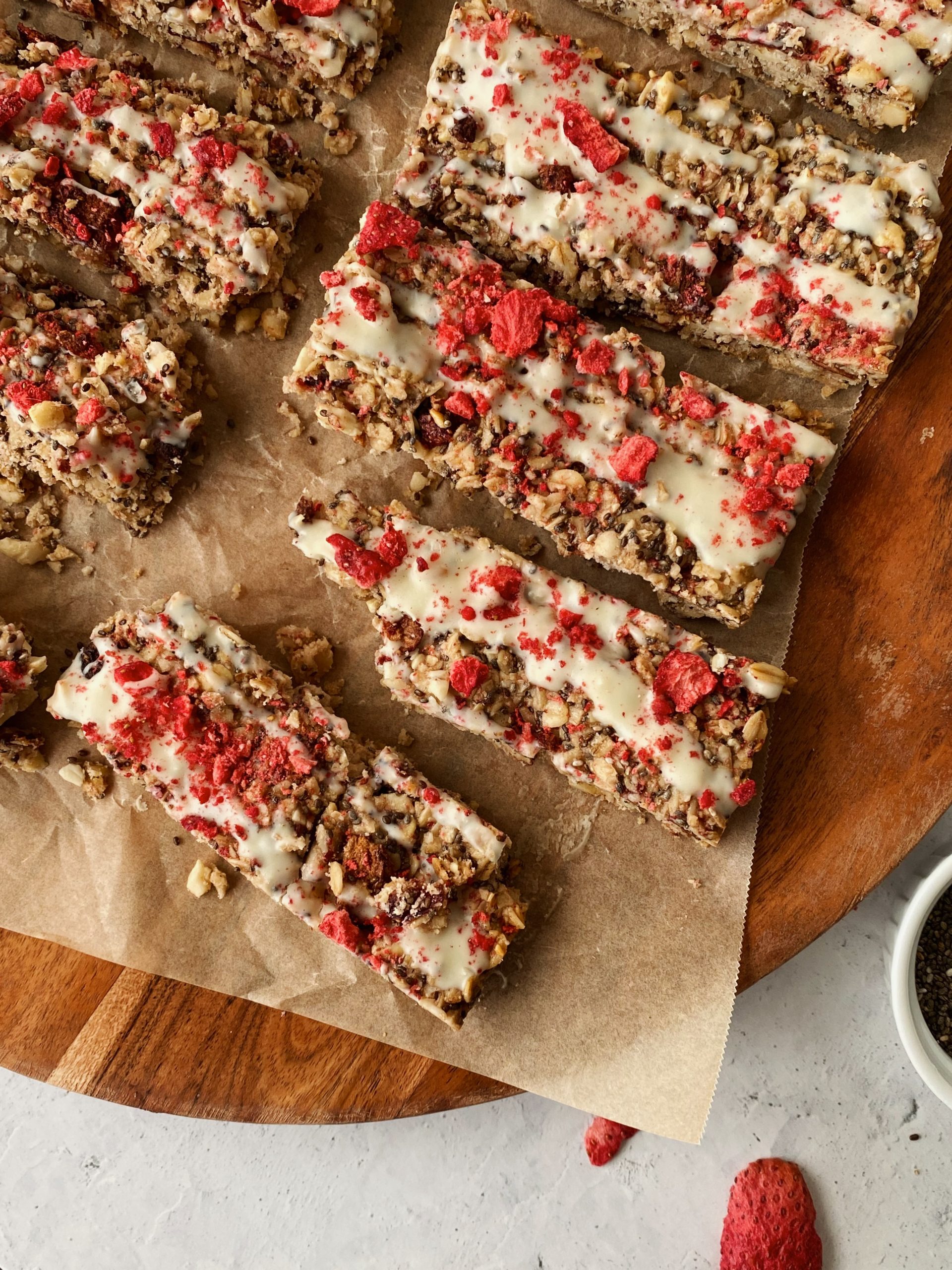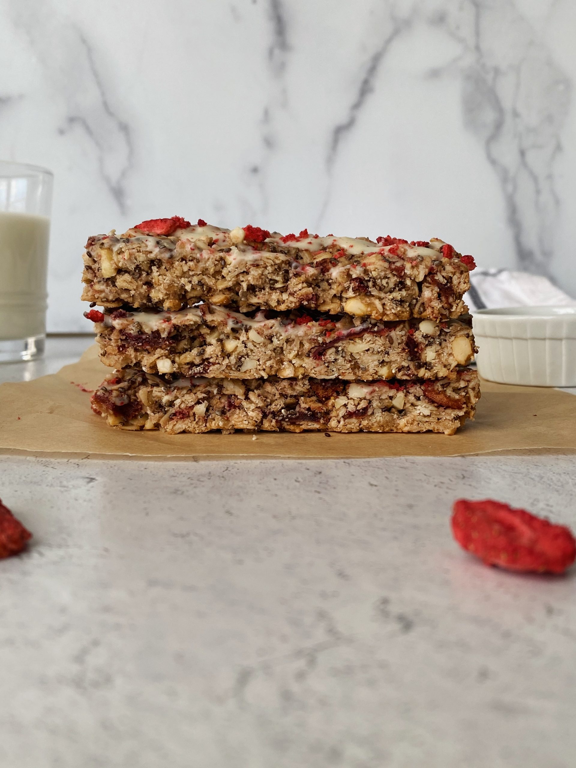 Chewy strawberry chia granola bars are the best breakfast bars to make this week! Filled with whole grains and healthy fats, and have a delicious strawberries & cream flavor!