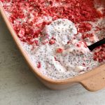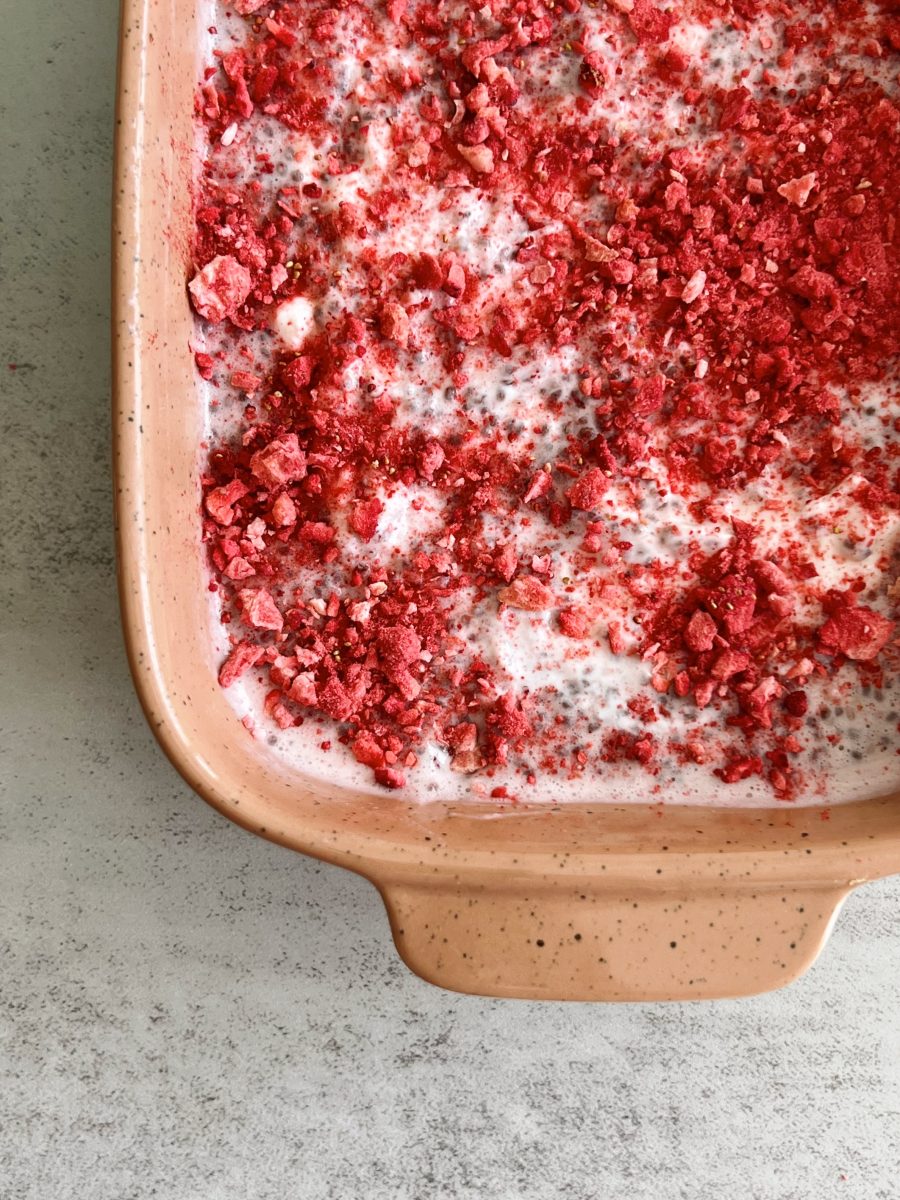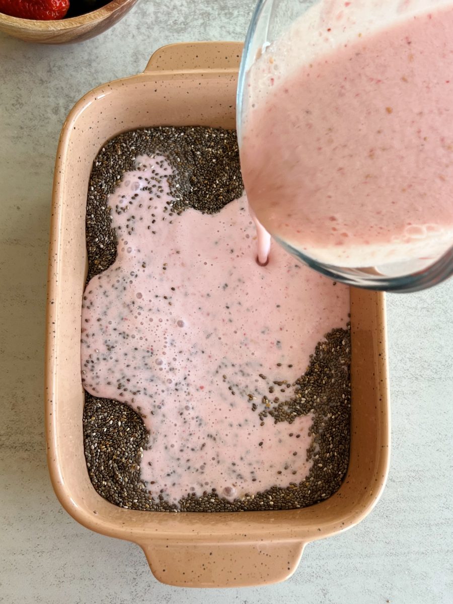 - Add the chia seeds to a small baking dish or container and pour in the strawberry milk and a pinch of salt. Whisk together well.