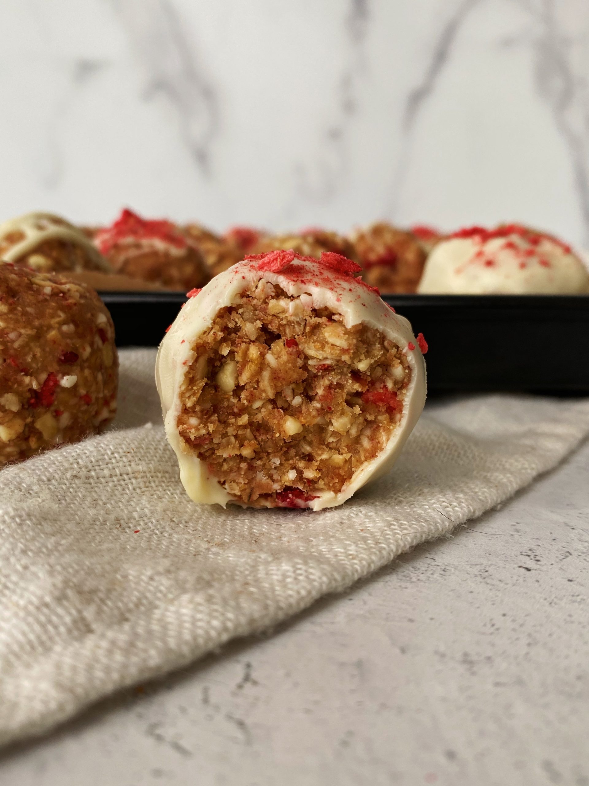 The combination of oats and cashews in these bites really give them that cake-like flavor. The freeze-dried strawberries add such a delicious sweetness, and truly taste like candy.