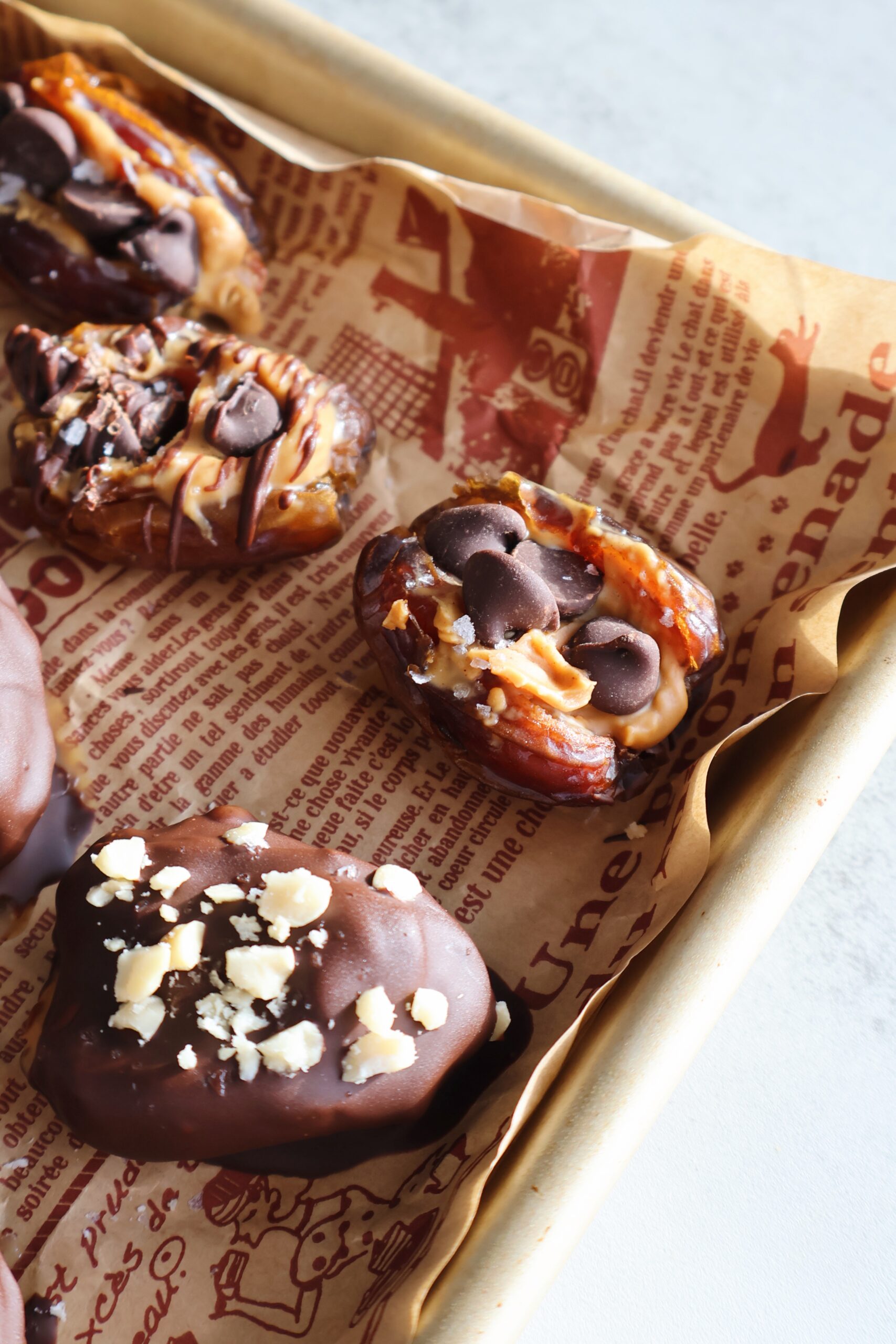 - Alternate between fillings: spoon about 1 tbsp of nut butter (peanut and almond) into each date, and stuff some with whole nuts and chocolate chips.