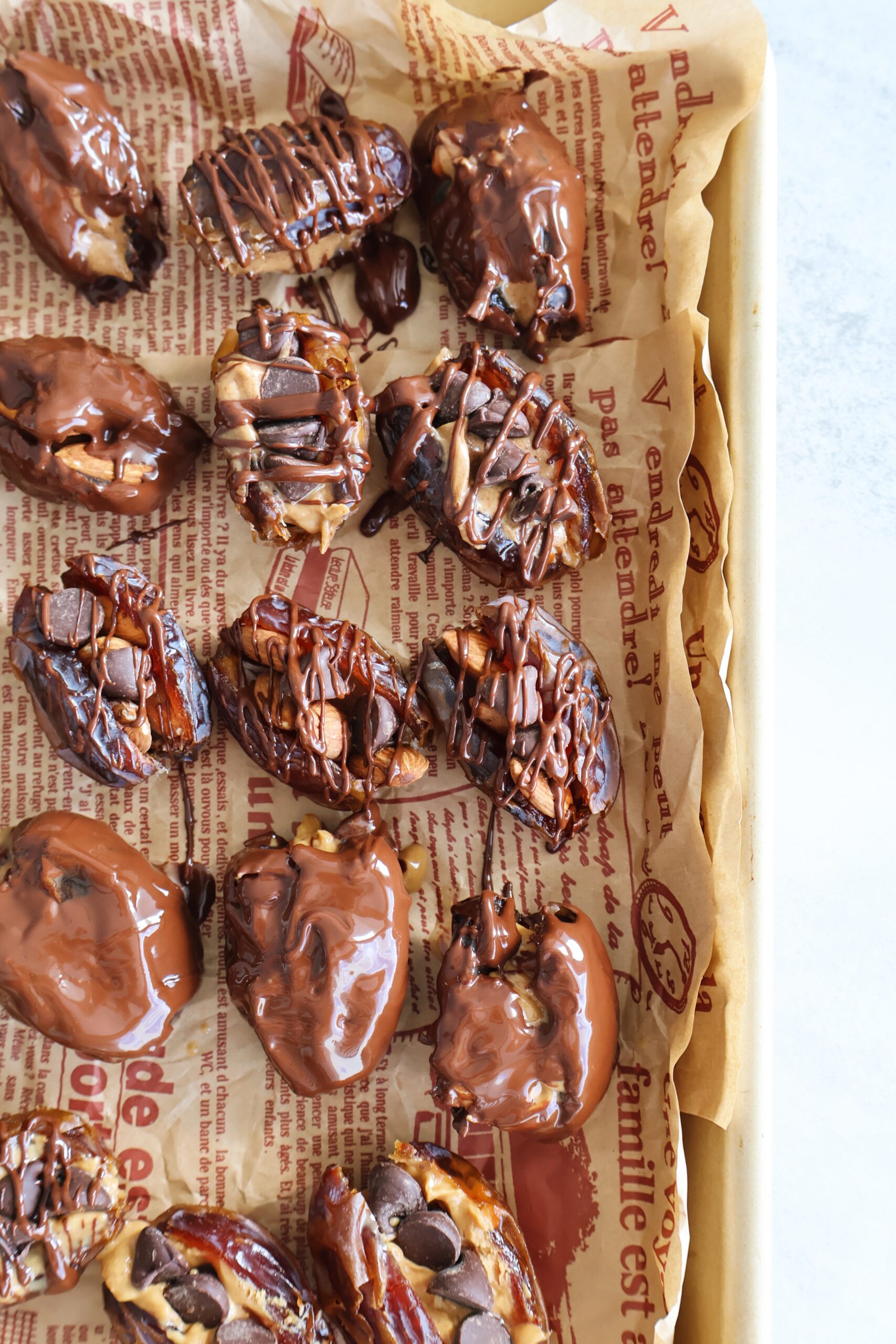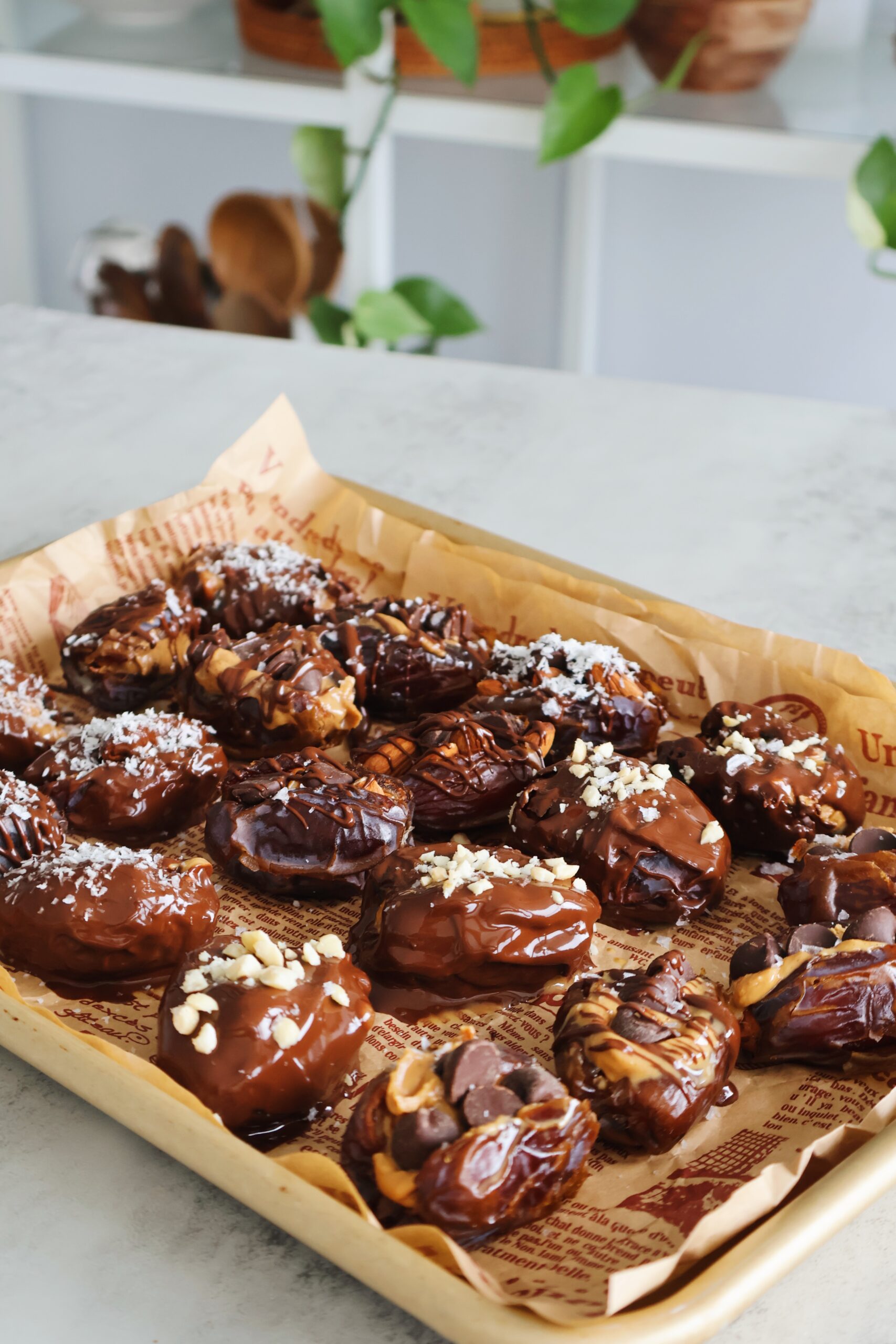 - Dip each date into the melted chocolate, or drizzle the stuffed dates with a light layer of chocolate over the the top.