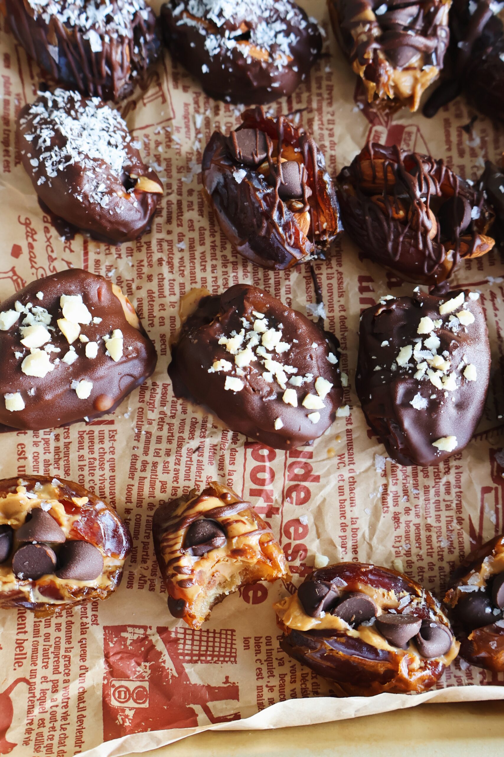These chocolate coated stuffed dates filled with a mix of peanut butter, almond butter and nuts have been a staple of mine for so many years. Medjool dates get pitted then stuffed with either peanut butter, almond butter or whole almonds. They then get dipped or drizzle with melted dark chocolate and topped with a sprinkle of flakey salt or coconut flakes.