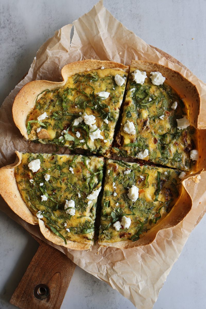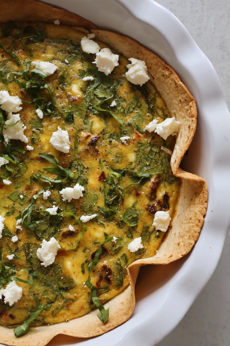 The base is made from blended eggs, cheese and cottage cheese that get mixed together with sun-dried tomatoes, spinach, feta and spices. Everything gets baked in a tortilla crust until browned, leaving you with a delicious and filling breakfast or snack.