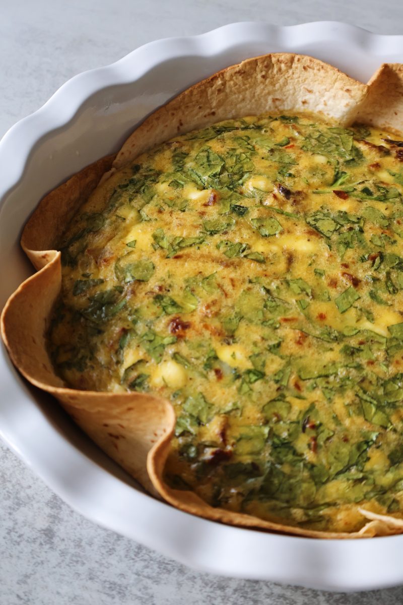 - Pour the filling into the tortilla crust and spread around evenly. Bake on the middle or lower rack of your oven for 20-25 minutes. The top should be firm to touch and the tortilla should be browned