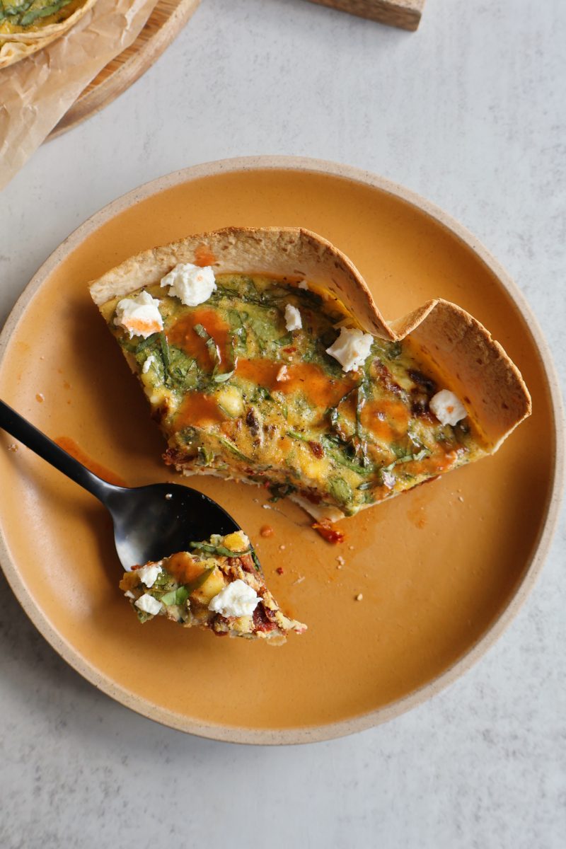 The trending tortilla quiche has caught my eye for quite some time, and I’m so happy to have finally tried it for myself. This fun spin on a classic quiche is made simpler by using a tortilla as a base instead of a pie crust, making this recipe a quicker and lightened up version for a nourishing meal prep.