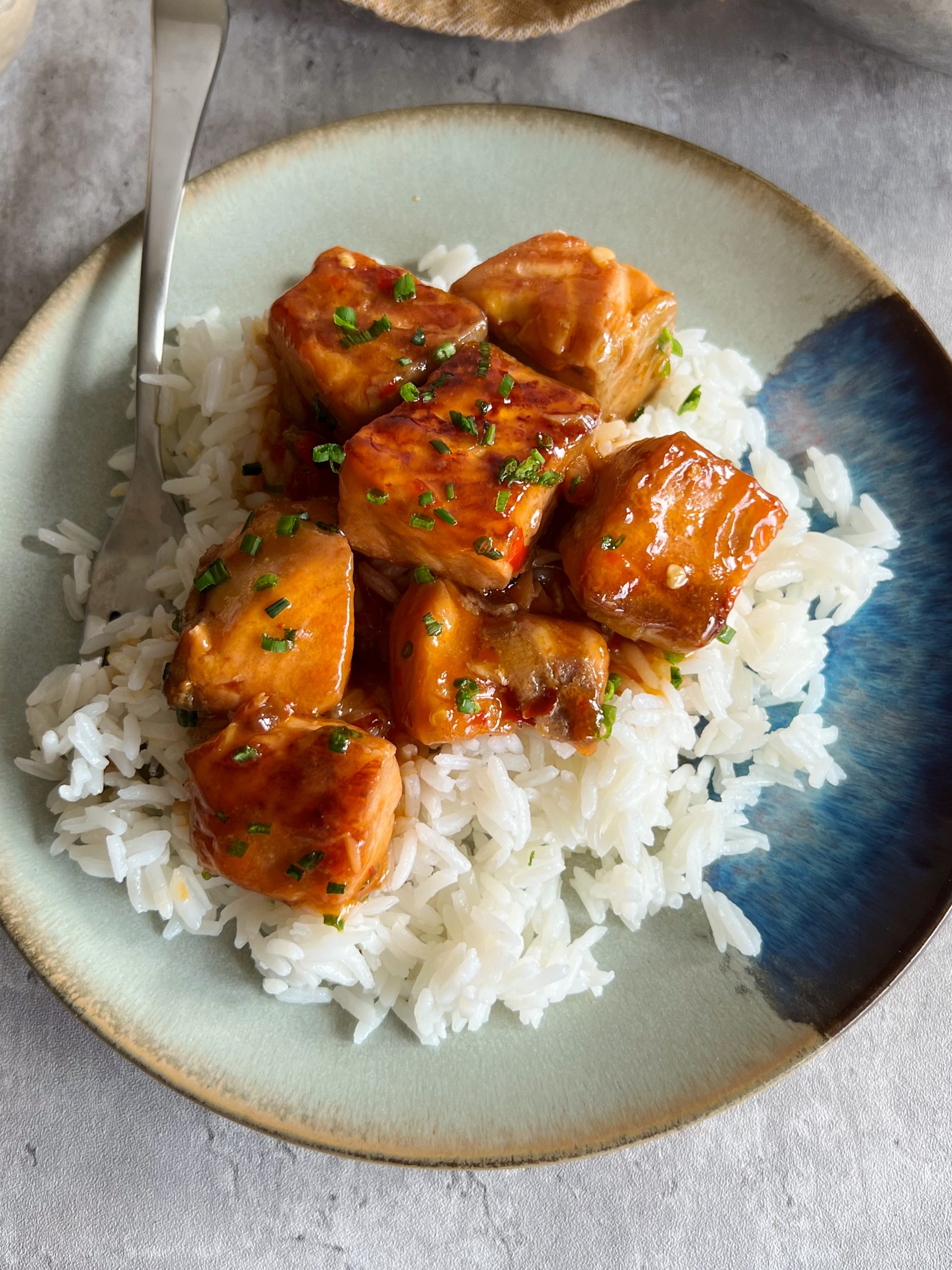 This sweet chili salmon recipe packs in so much delicious flavor. The salmon cubes are seared until brown on all sides, then simmered in a sweet and spicy chili garlic sauce.