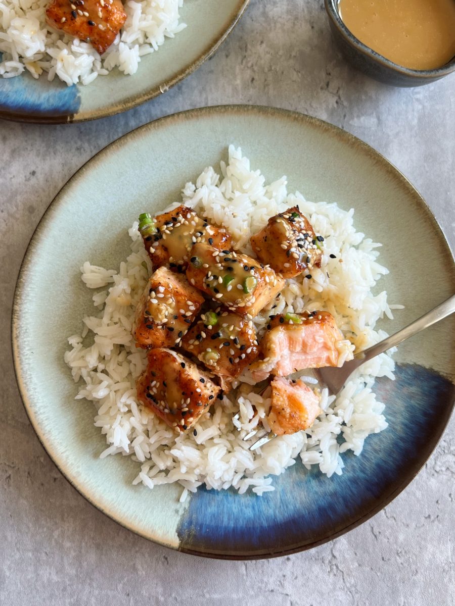 These tahini maple glazed salmon bites are sweet, savory and taste delicious over fluffy rice. They’re lightly seasoned and pan-fried, then topped with a creamy maple tahini glaze.