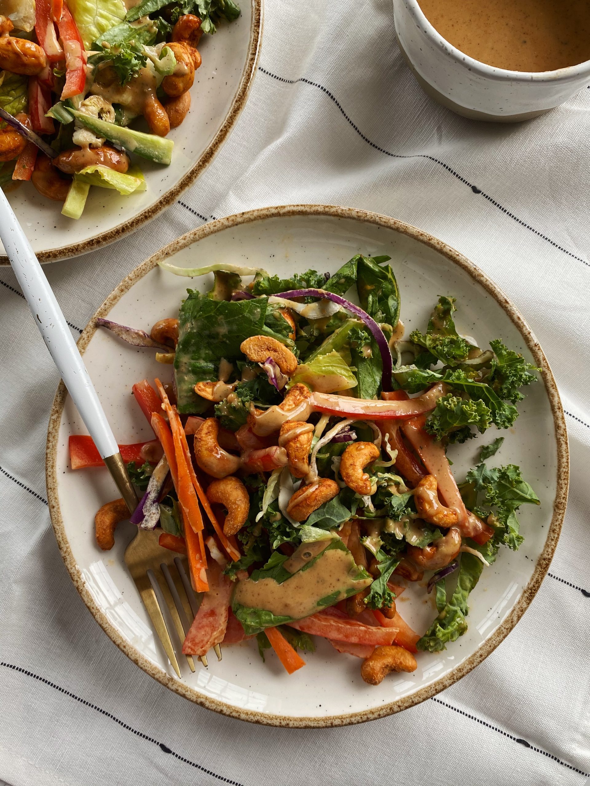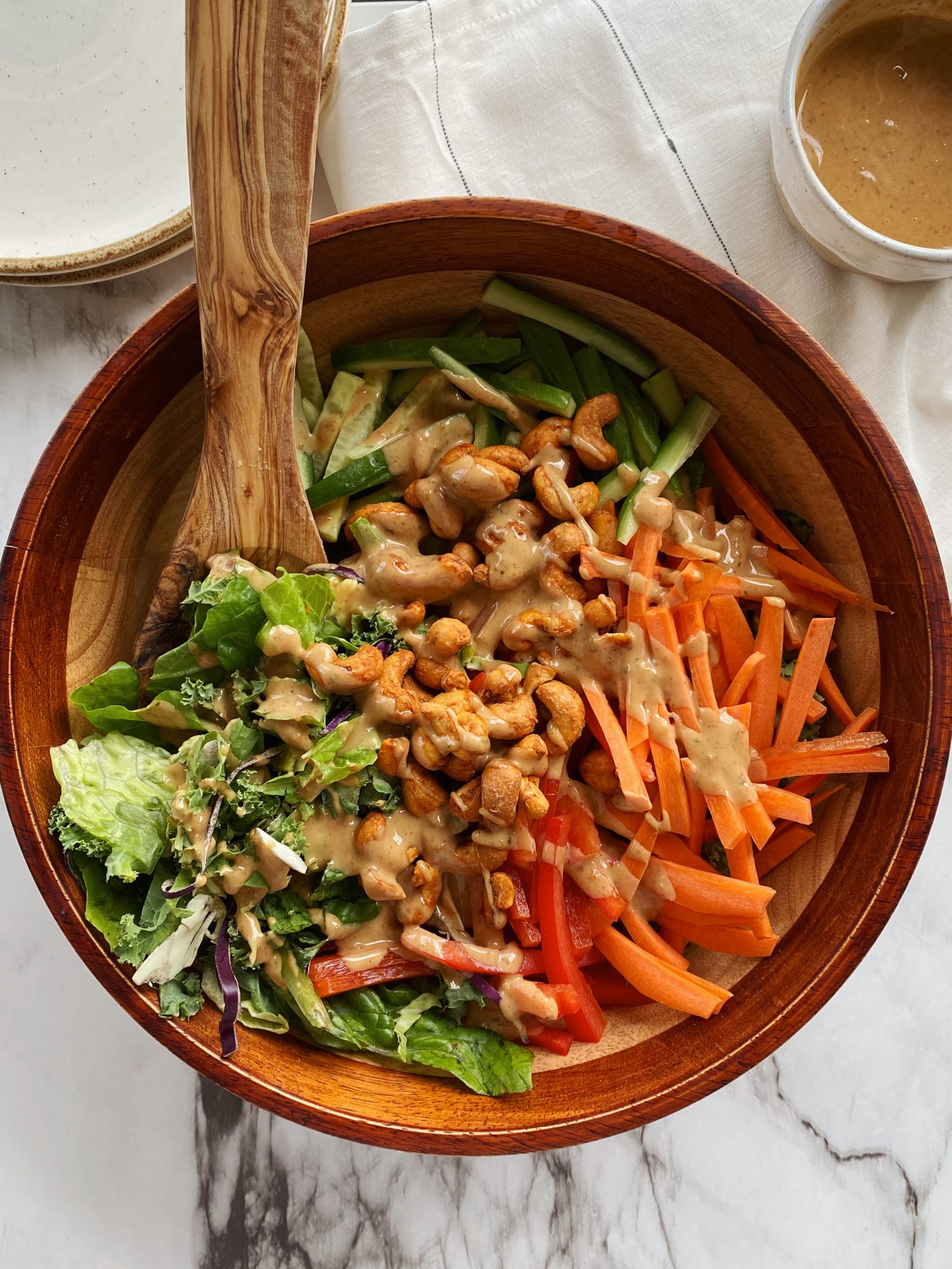 The spicy peanut dressing is so good and creamy, it’s a staple in our house. I always say a salad is as good as its dressing. Gone are the days we fear creamy dressings- amirite?