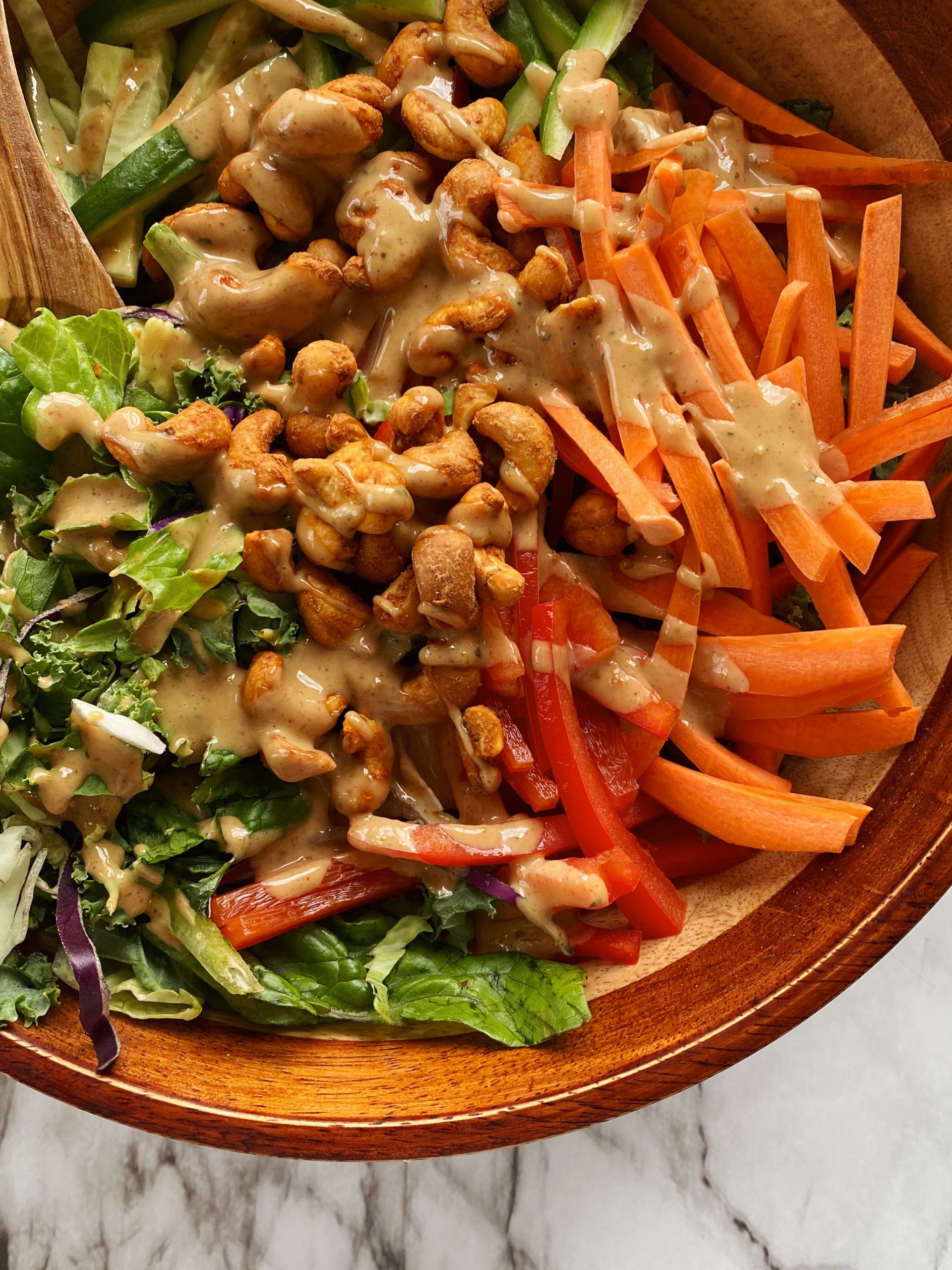This Thai salad with peanut sauce checks all of those boxes. You’ve got veggies of all colors (green, orange, red, purple), roasted cashews for an added crunch, natural sweetness from the bell peppers & peanut butter, and most importantly, a kick ass dressing.