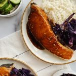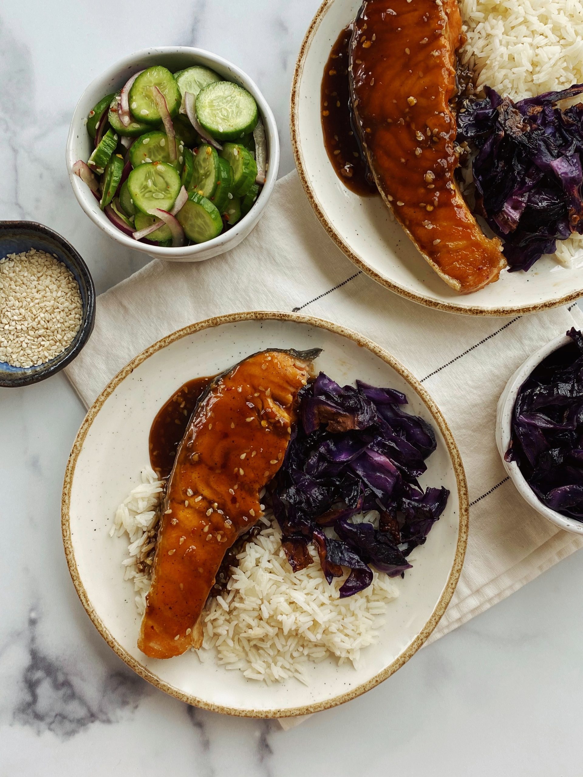 Sweet coconut rice, crunchy sesame cucumber salad, and a simple side of roasted cabbage. It’s so simple, yet tastes incredible.