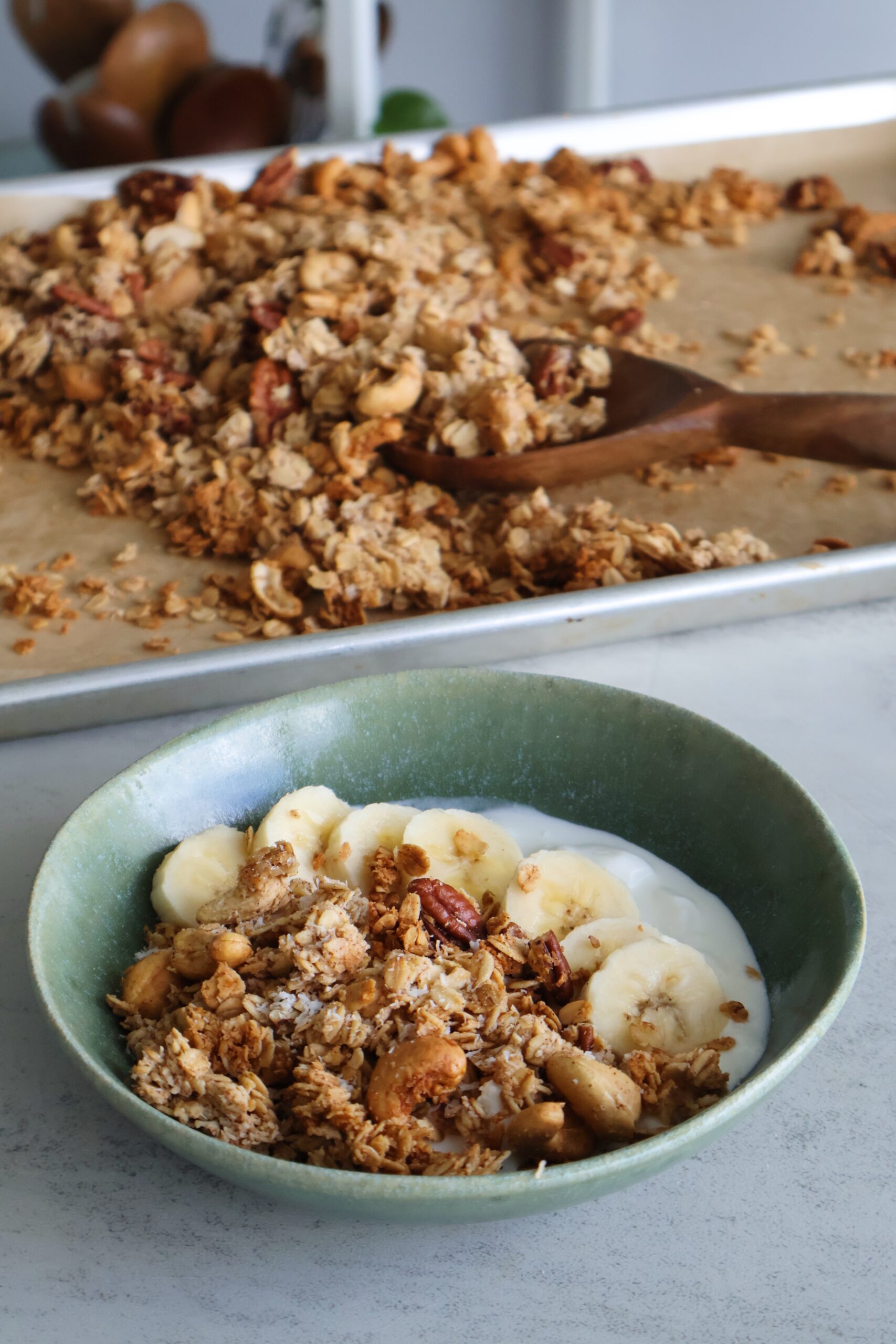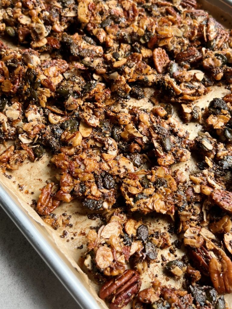 To serve, I love topping yogurt bowls with the granola or sprinkling some over cereal bowls for even more added crunch and flavor.