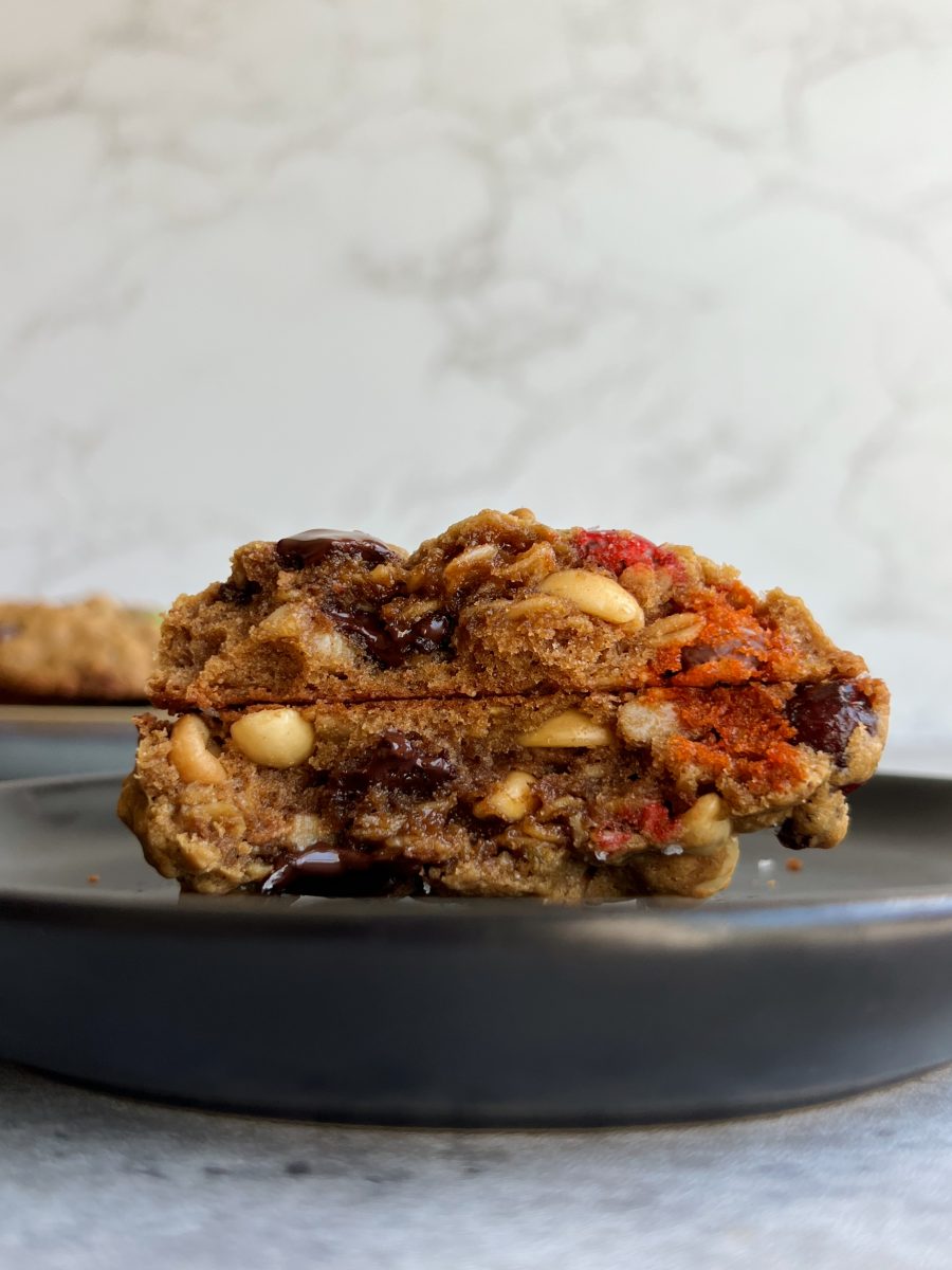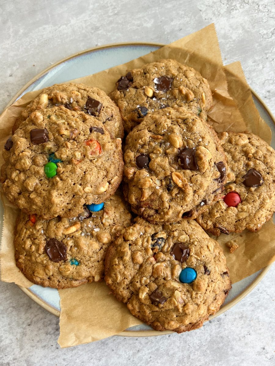 These extra thick cookies are such a fun treat to make filled with so many good mix-ins. They’re loaded with peanut butter, oats, chocolate chips, nuts and m&ms, and are basically trail mix in cookie form.