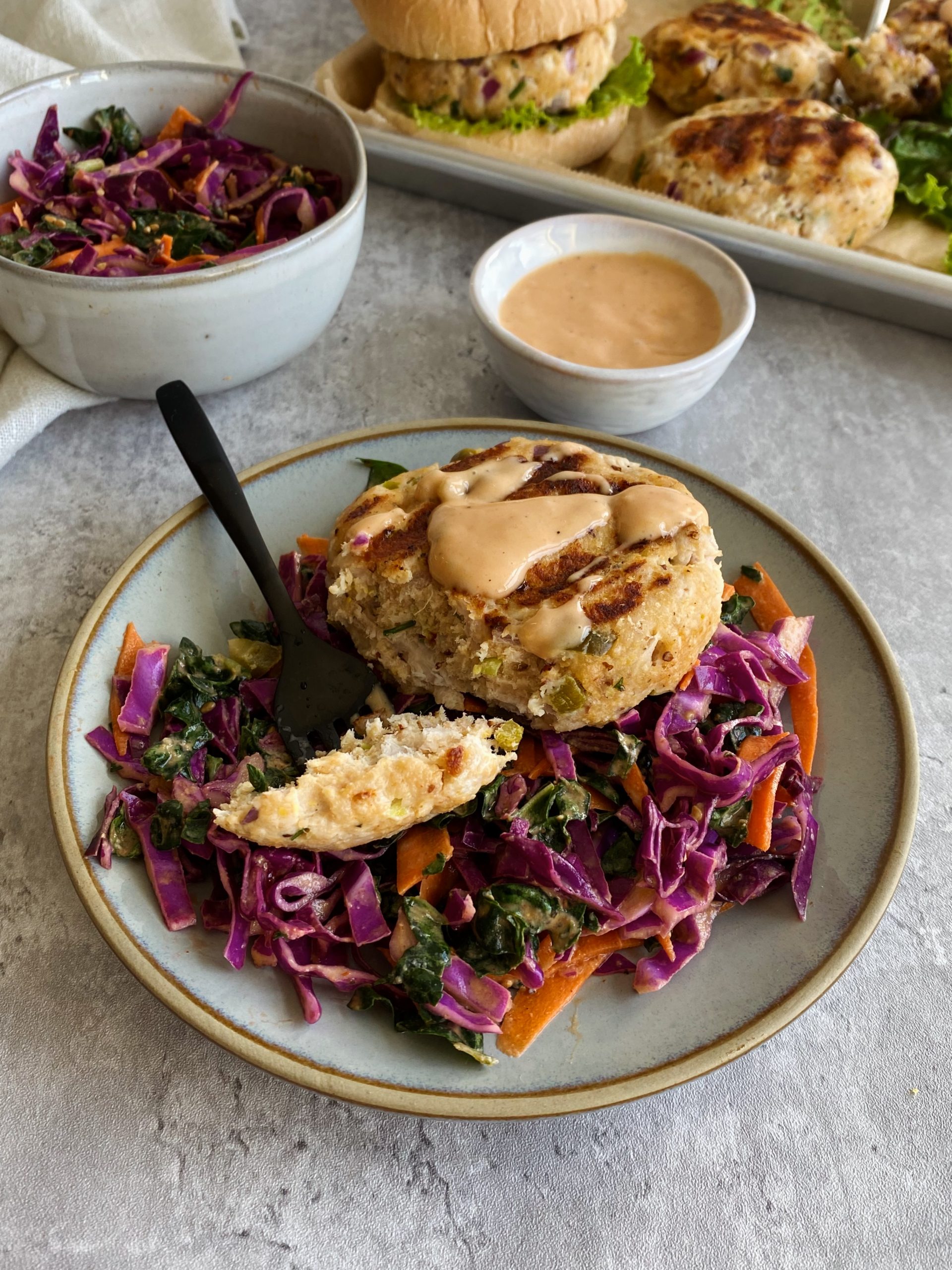 Homemade fish burgers are a quick and easy dinner idea for the week. They’re packed with fresh ingredients and taste delicious served with a spicy tahini coleslaw salad.