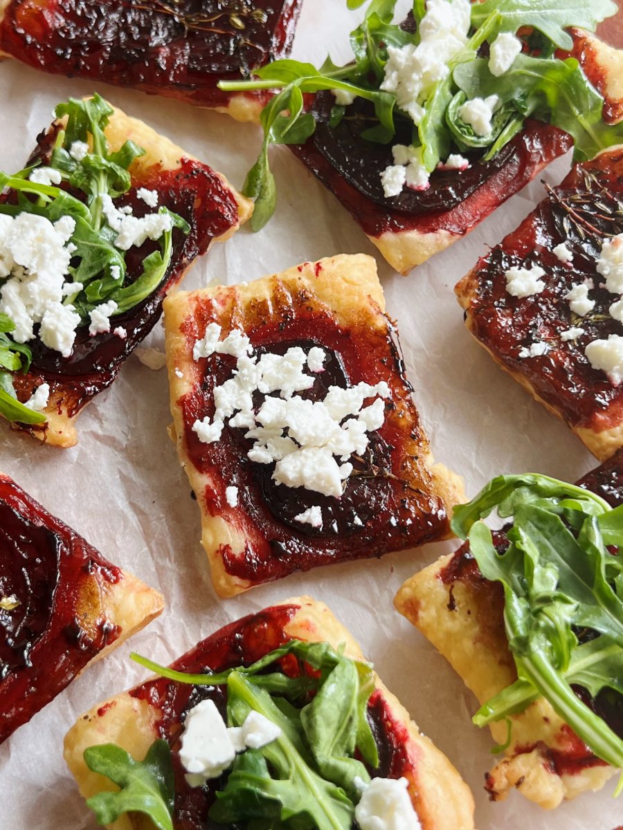 Upside down puff pastry with balsamic beets, arugula and feta cheese. A delicious appetizer or side dish to make for any occasion.