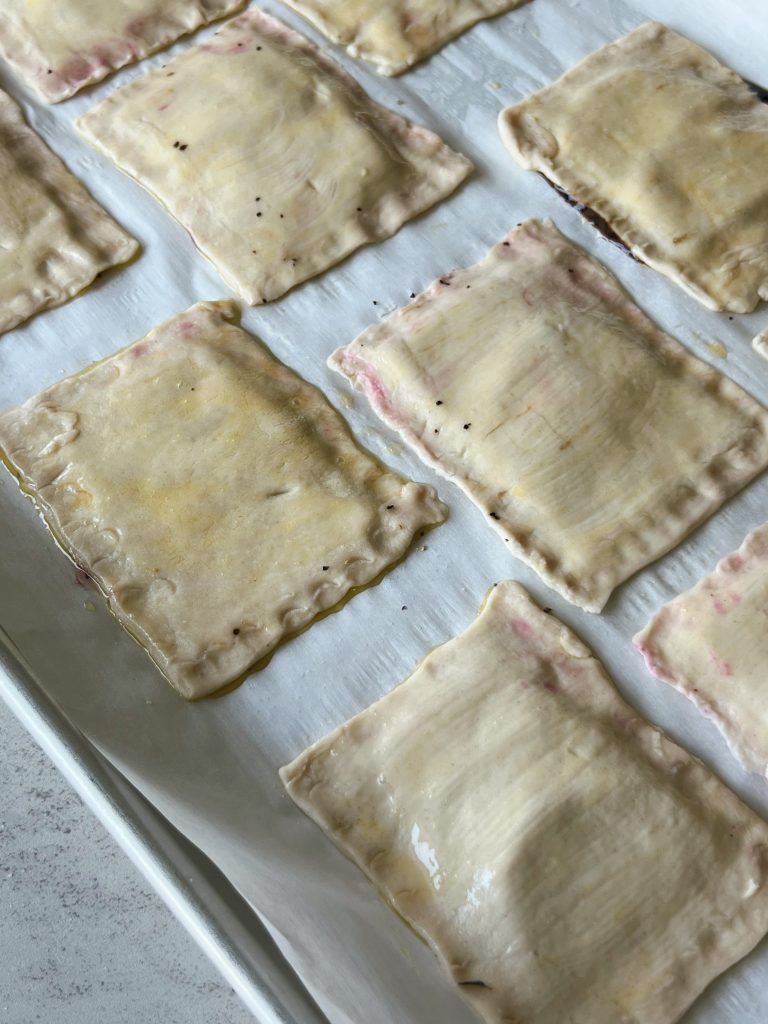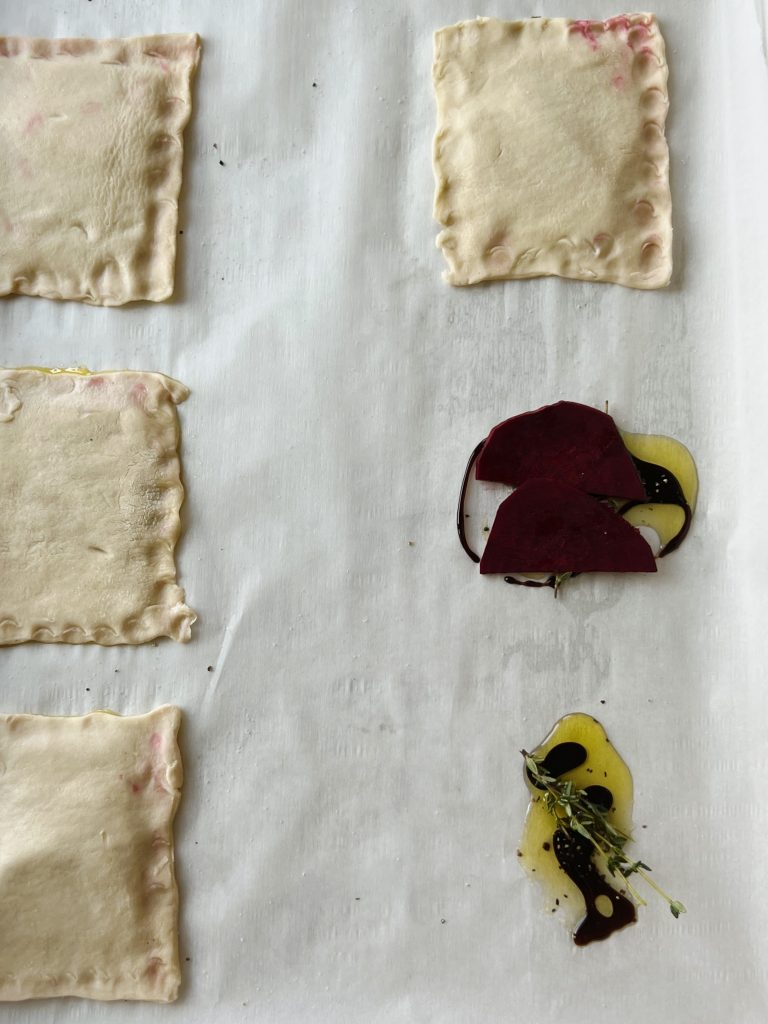 - Repeat with remaining beets and pastry, making sure to separate them enough on the pan so that they don’t touch. Once the pastries are all assembled, brush the tops with whisked egg.