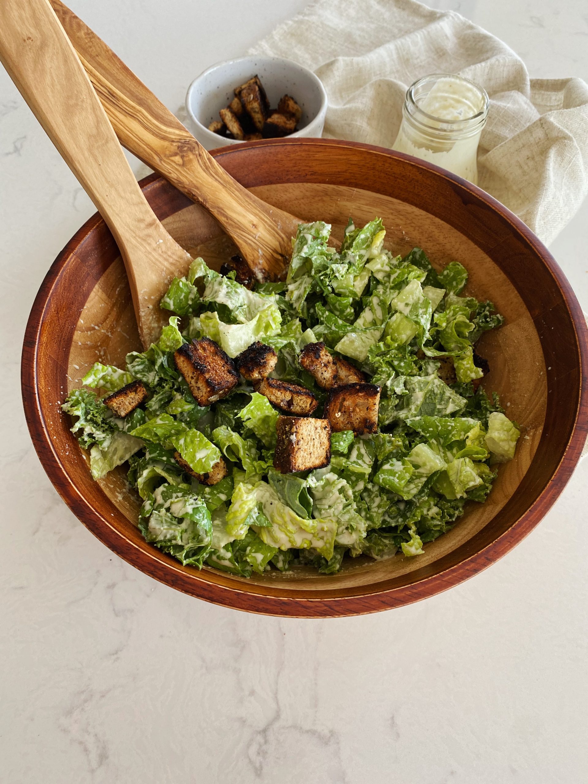This vegan Caesar salad easily became one of our favorite salad recipes. Since we keep a kosher household, we don’t eat dairy and meat together, so I’m able to pair this with grilled chicken for my husband without compromising flavor!