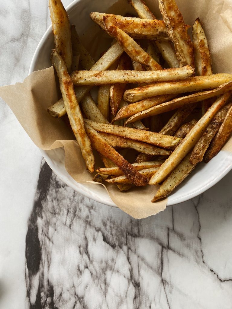 They key to get the potatoes crispy are slicing them super thin and making sure to not overcrowd them on the pan, because no one likes a soggy French fry.