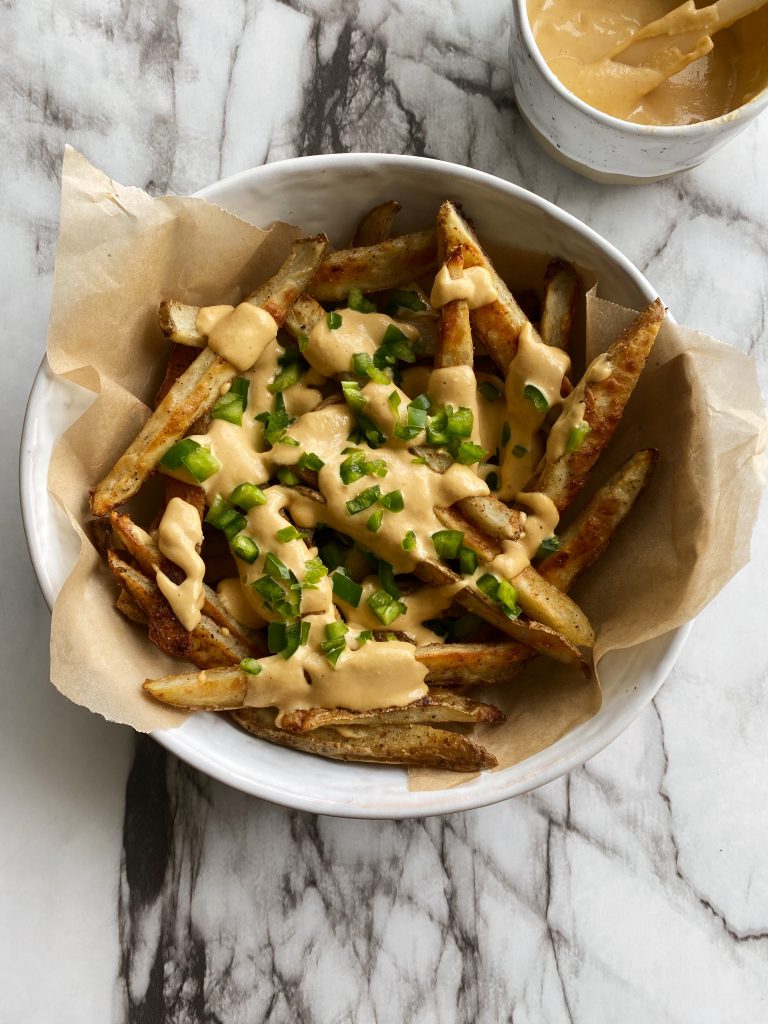 - Once fries are ready, top with cashew cheese sauce and chopped jalapeño.
