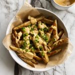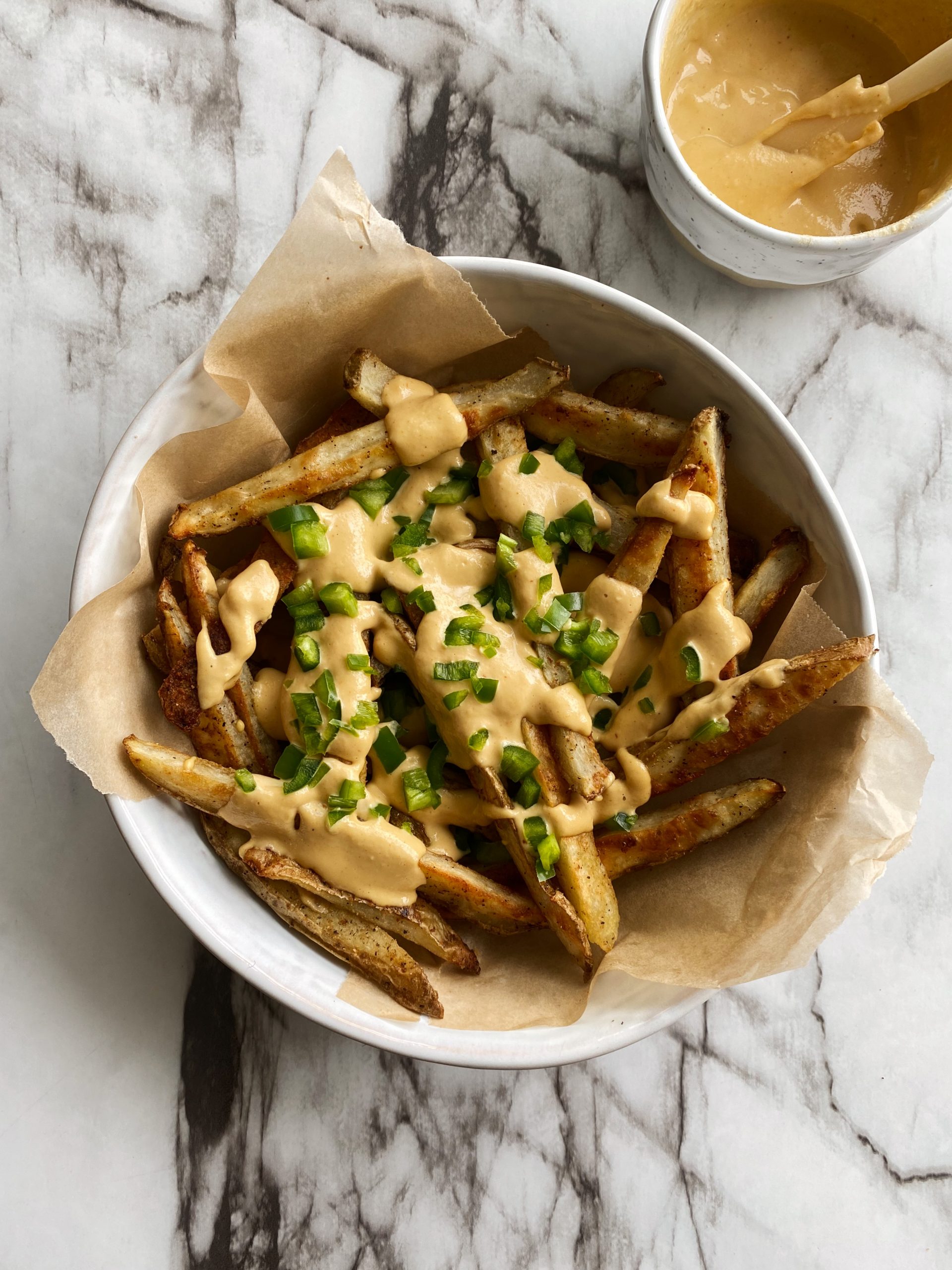 I won’t sit here and tell you all about how I grew up eating cheese fries and was looking for a healthier version, because I probably only ate cheese fries twice in my life. BUT- I love French fries, and I love this cashew sauce, so thought why not combine the two.