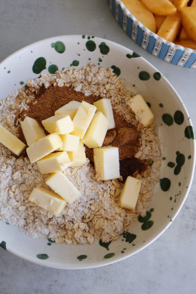 - Cut the butter into small pieces and add it to the dry mix. Work it into the oats using your hands to create a crumble topping